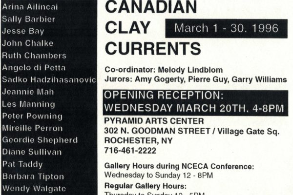 March 1, 1996 - March 30, 1996March 1, 1996 - March 30, 1996 Canadian Clay Currents is a juried exhibition of…