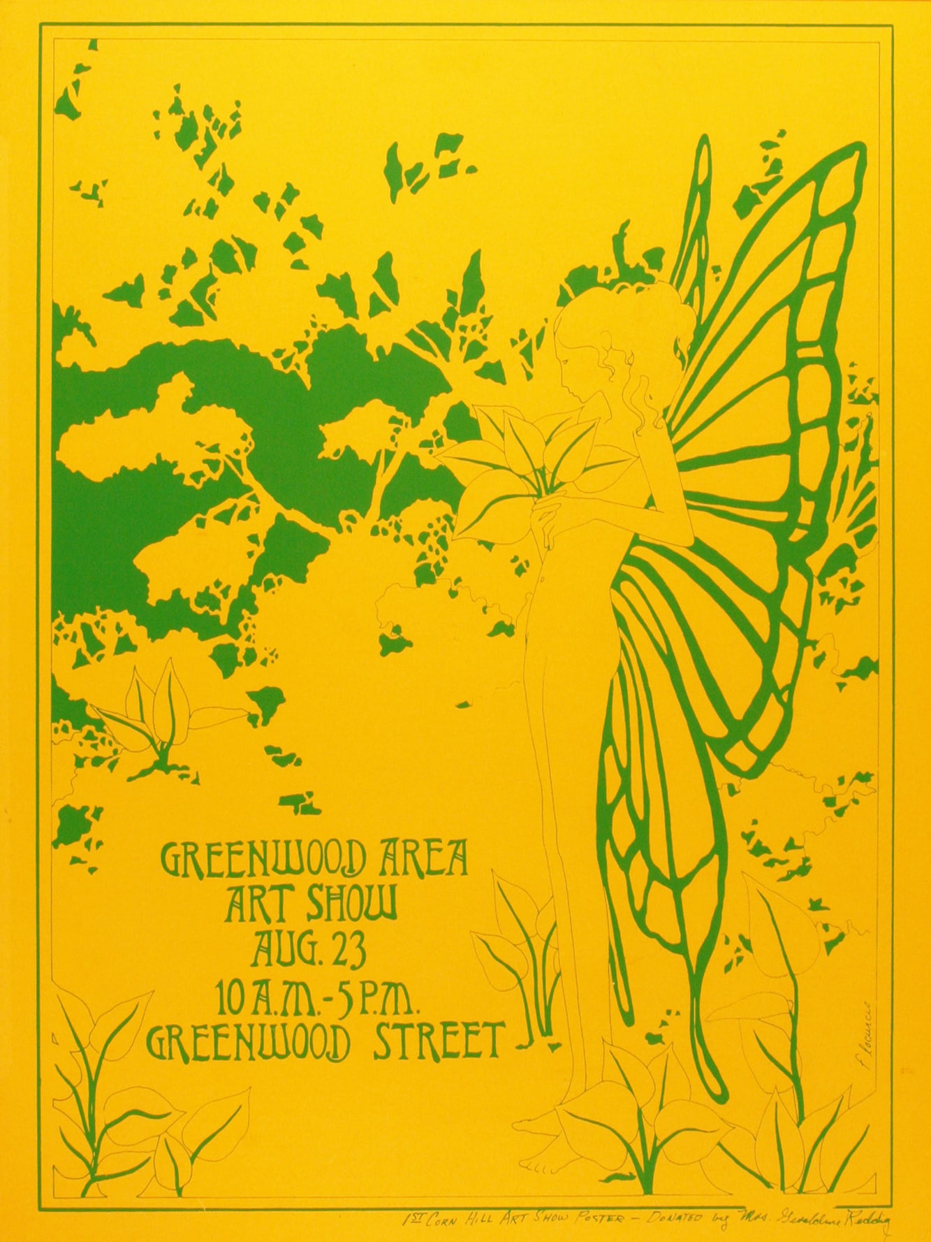 The original 1969 poster highlights the “Greenwood Area Art Show” on Greenwood Street in Corn Hill. Designed by Frank Locurcio, a Corn Hill resident, this poster had a limited run of 50 prints.