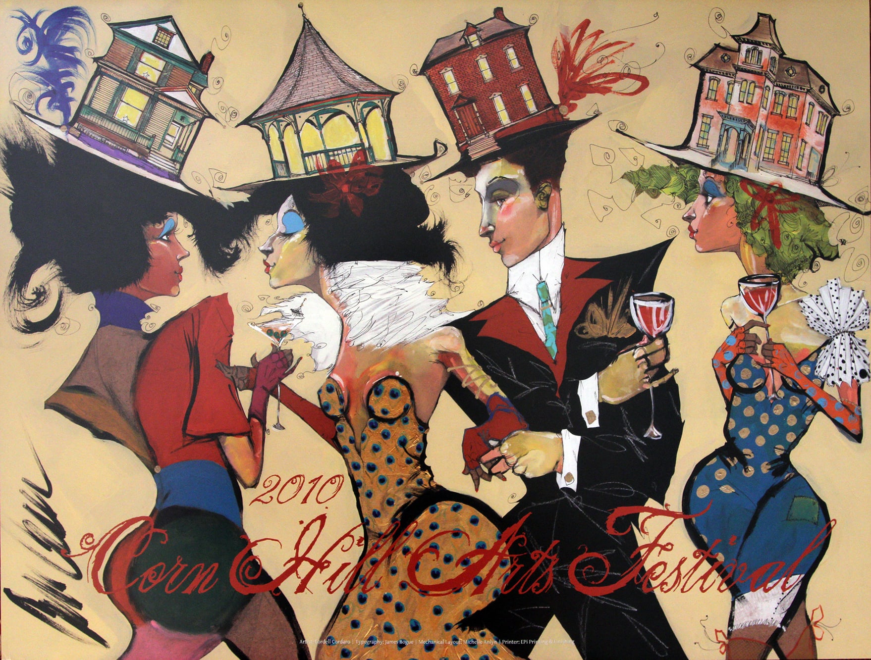In 2010, Rochester artist Cordell Cordaro created a stylized depiction of the vivacious social atmosphere of Corn Hill. It thrilled visitors with the juxtaposition of historic Corn Hill homes as hats and quickly sold out.