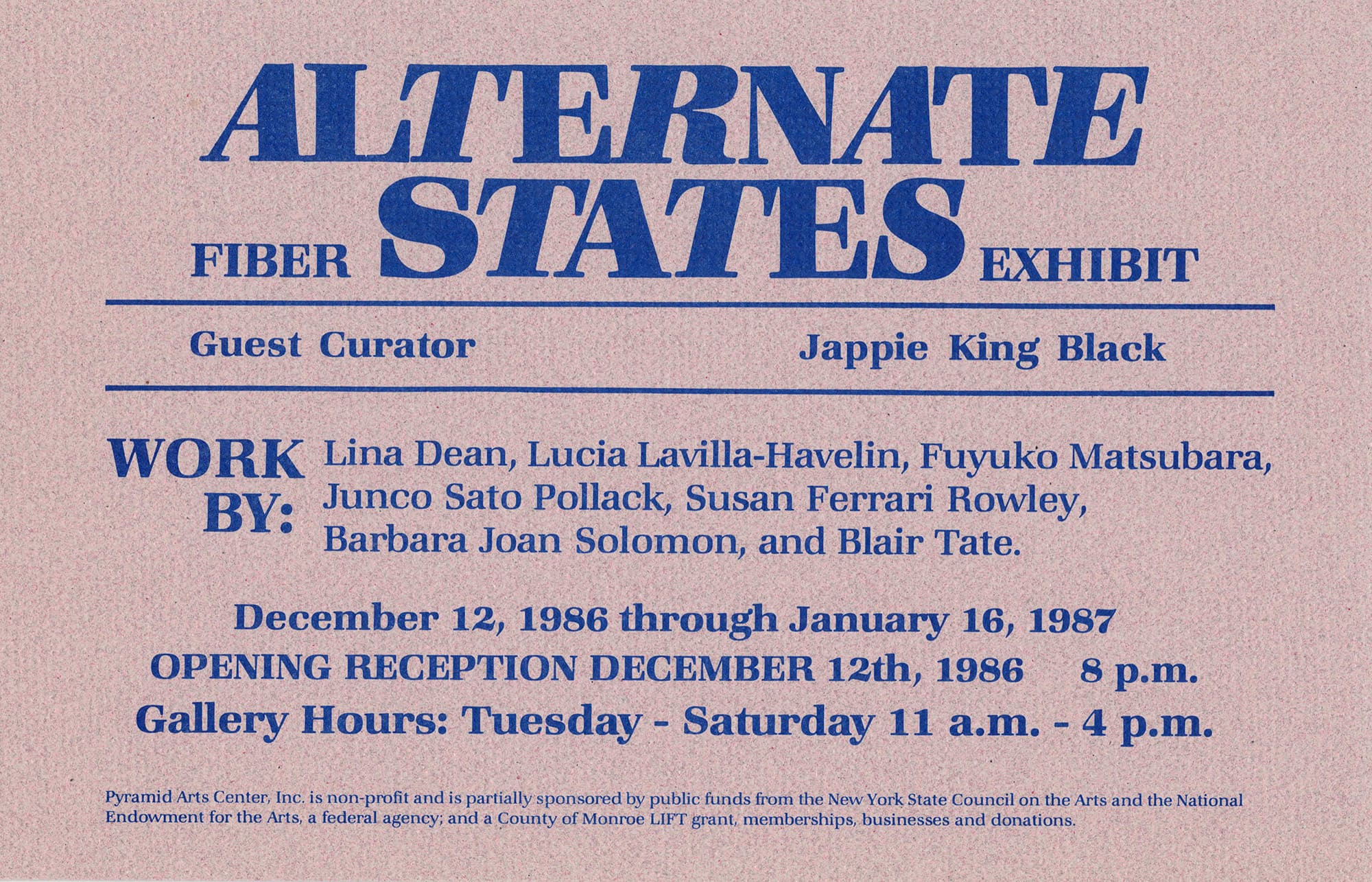 Alternate States: Northeast Fiber Art is an invitational exhibition of nontraditional fiber art from artists in the Great Lakes Region and New England. The exhibited works include weaving, needlepoint, and textile sculptures.