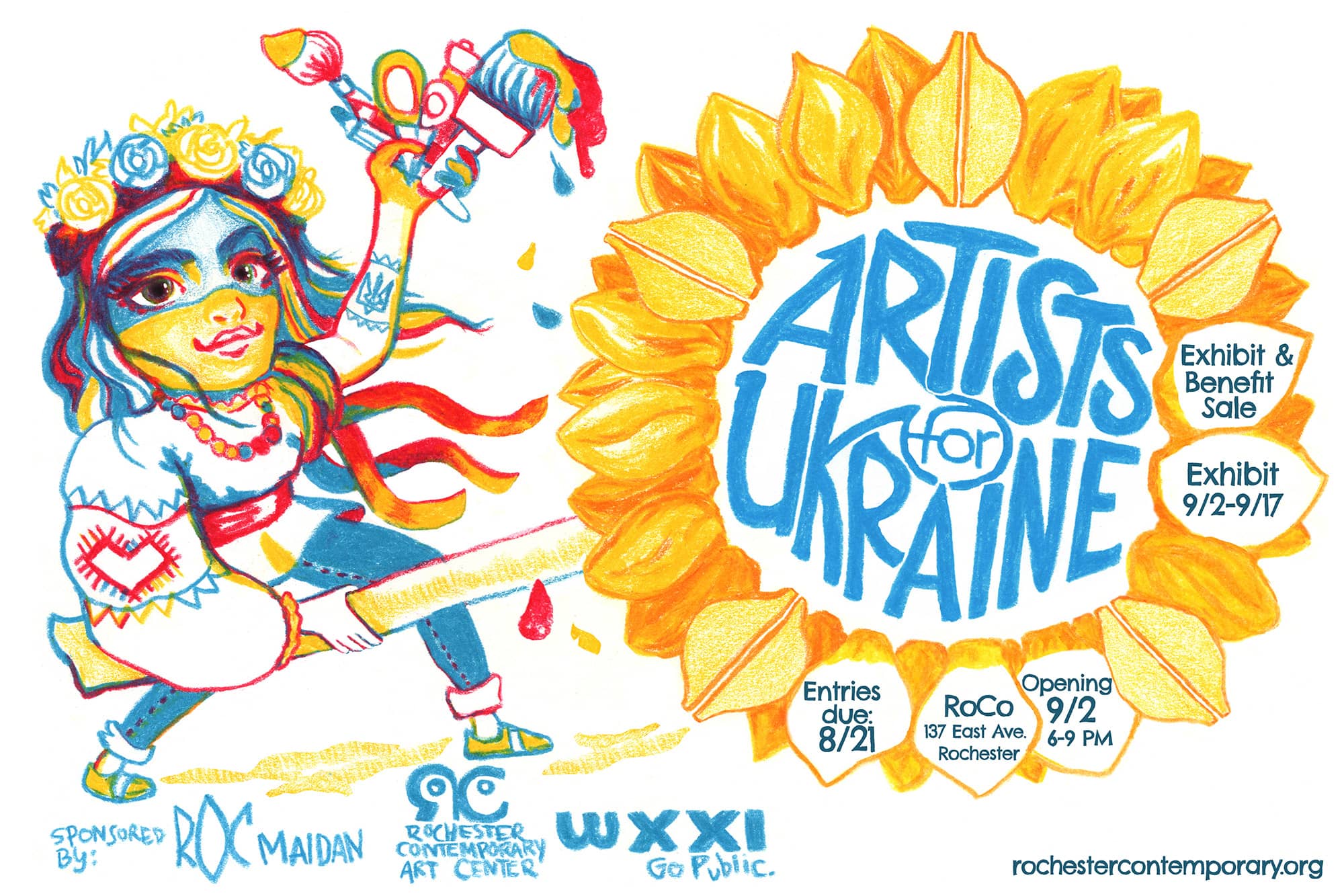 Artists for Ukraine is a fundraising art exhibition and sale, produced in partnership with WXXI, and RocMaidan, a local nonprofit providing humanitarian and medical aid to Ukraine (in association with the Ukrainian Cultural Center of Rochester). 100% of the revenue generated by the sale of these artworks will go towards providing aid to the people of Ukraine.
