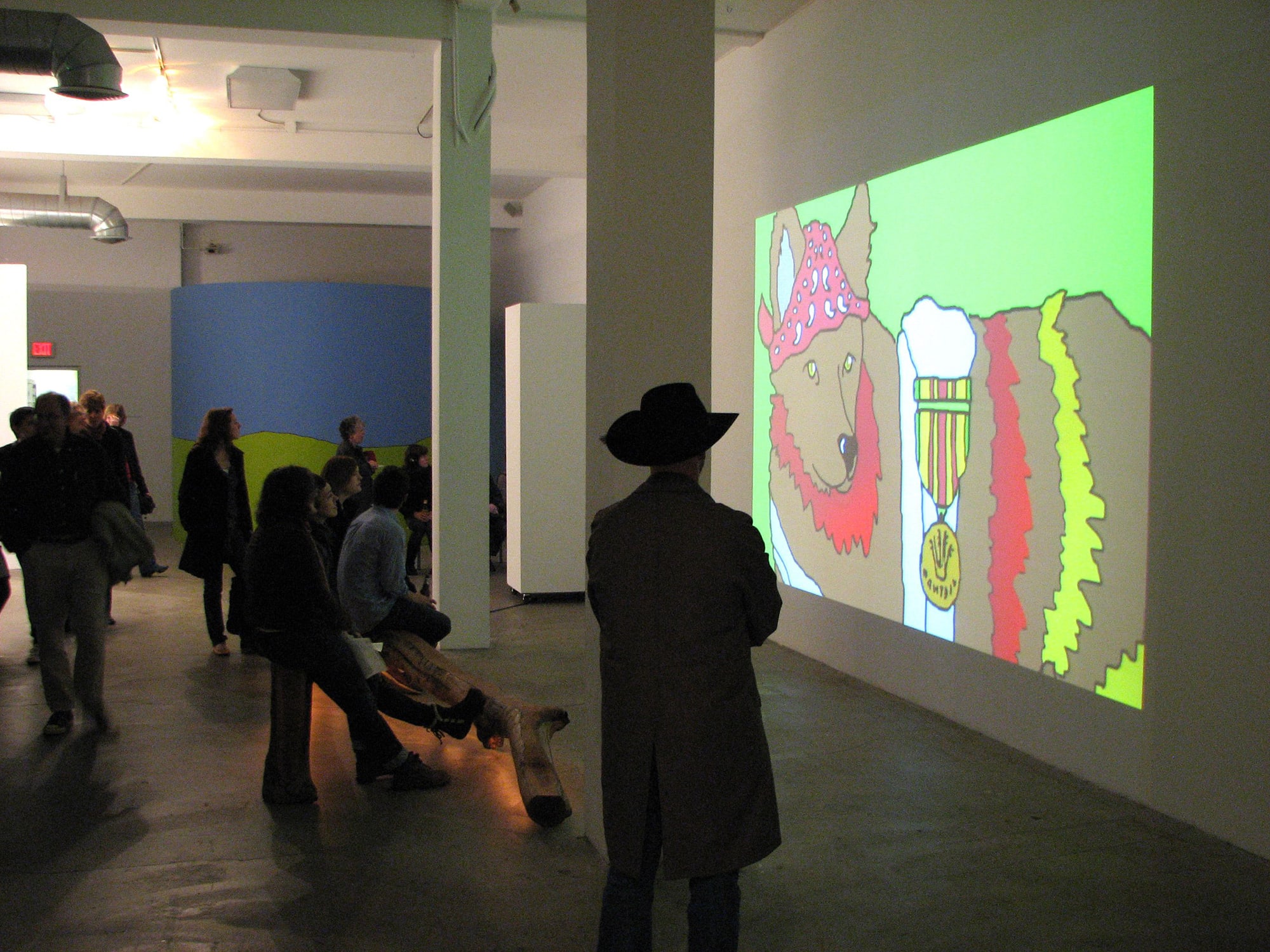 The new and recent video installations featured in the exhibition attract, repel, and astonish. Duke & Battersby’s episodic video works bring together found video footage, simple animation, anthropomorphic animals, drugs, lessons in existential philosophy, and song to explore such universal concerns as faith, understanding, depression, isolation, and of course, why humans suck. The video Beauty Plus Pity offers dark, humorous, otherworldly vignettes while its star actors, taxidermied animal “spirit guides,” greet and confront the gallery visitor from the real, furry, yet very dead, animal domain.