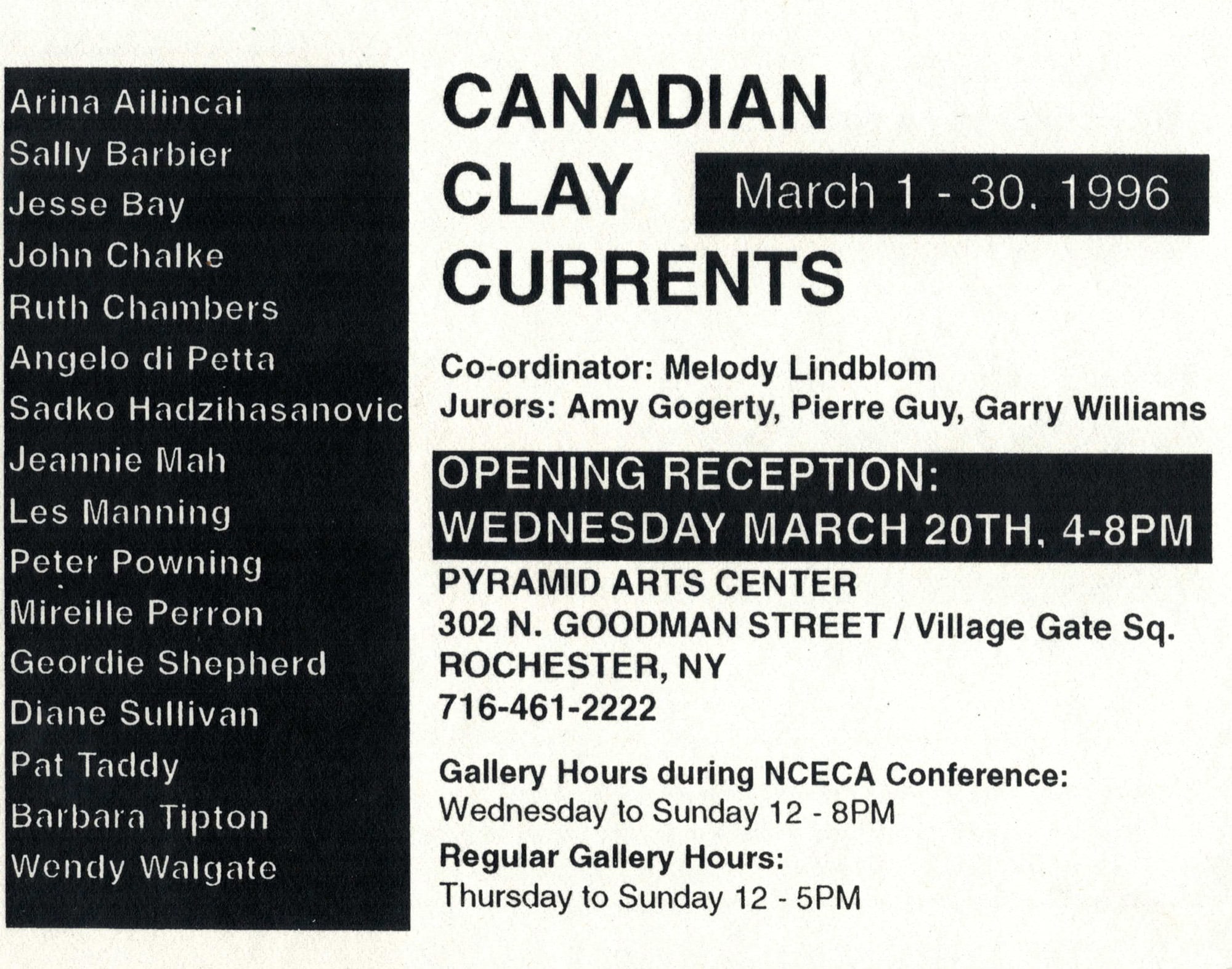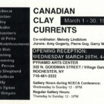 Canadian Clay Currents is a juried exhibition of 16 Canadian artists. The exhibition features a variety of functional, sculptural, and installation works primarily made of clay. The exhibited artists are involved in broadening the traditional definition of ceramics through developing new technological processes, tackling unique subject matters, and challenging the conventional presentation methods.