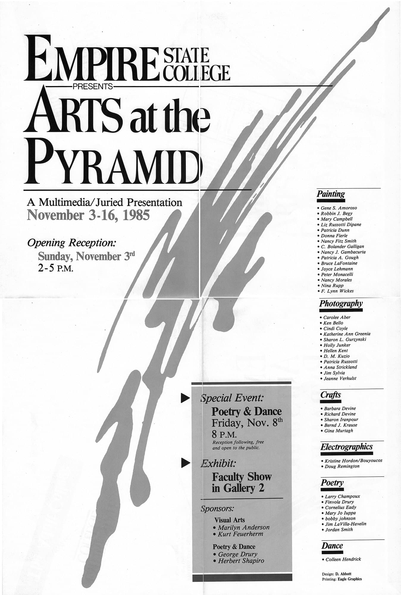 Empire State College (ESC): Arts at the Pyramid is a juried exhibition presenting multimedia works by artists from ESC. Painting, photography, crafts, electrographics, poetry, and dance are featured.