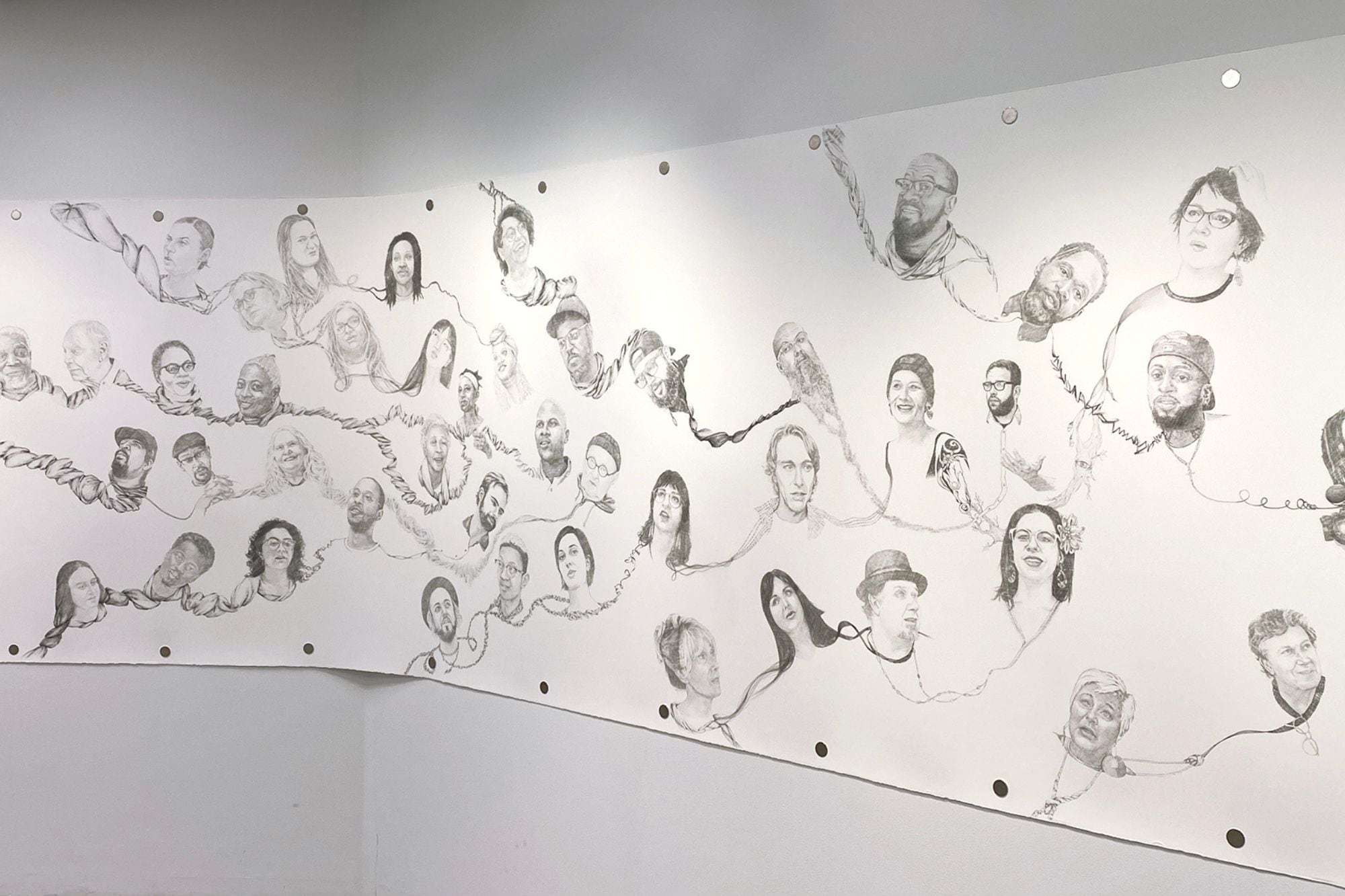 'Entanglement' is a 33' long drawing by Su Begy which features 98 portraits of creatives in the Rochester community. This monumental artwork was started during our exhibition State of the City and has continued onsite at RoCo Upstairs. The public is now invited to view this major work as the artist adds the final details.