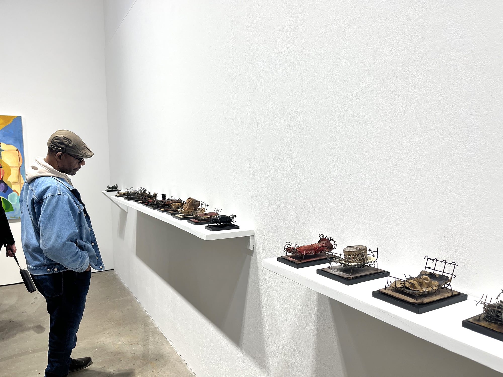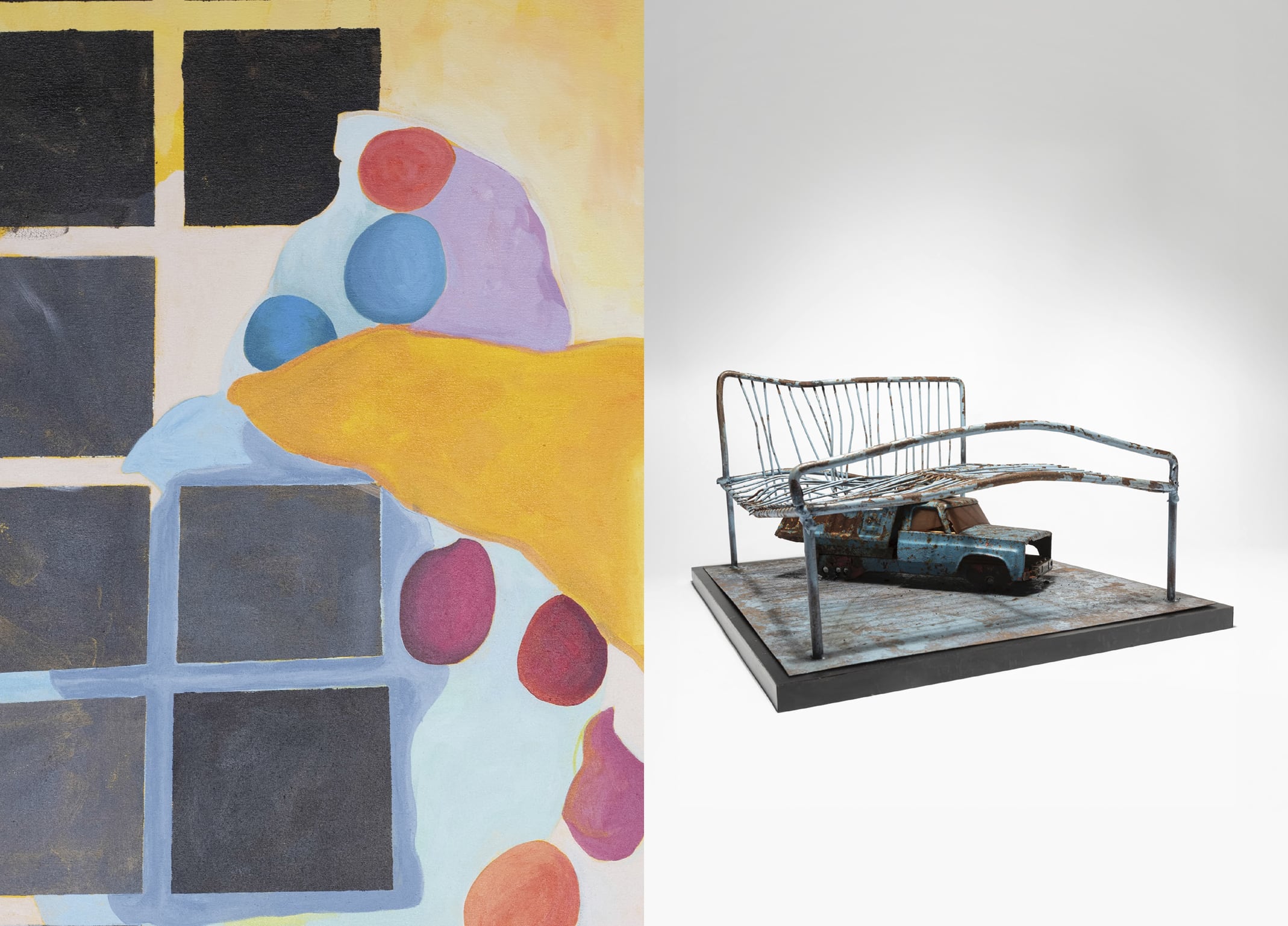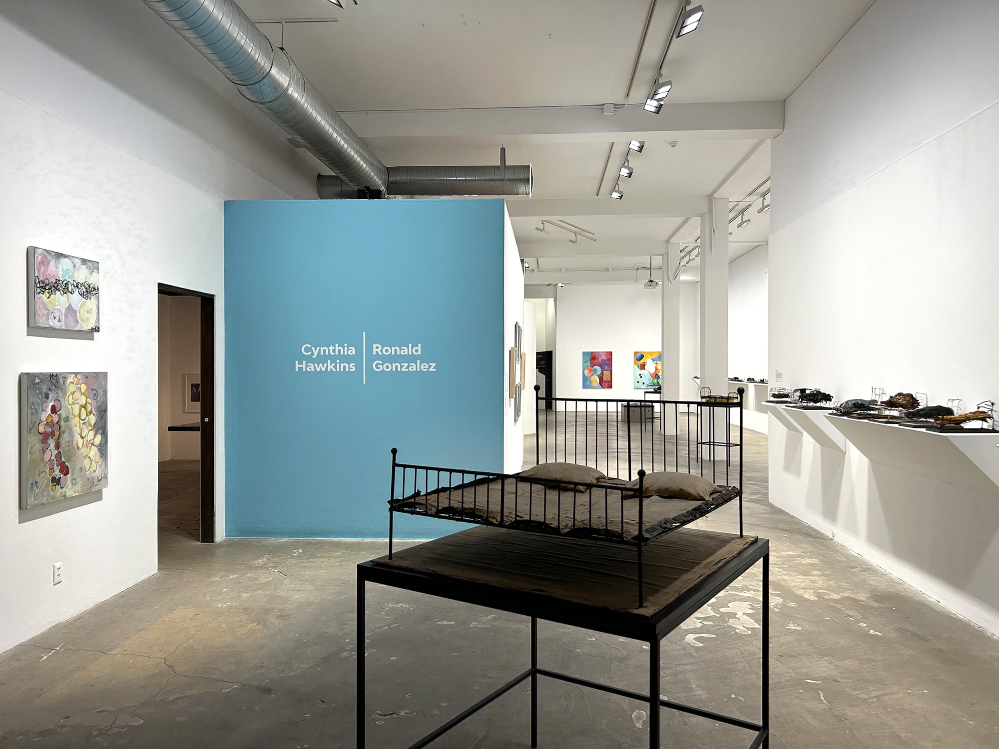"Hawkins/Gonzalez" presents the compelling artistic visions of Rochester-based painter, Cynthia Hawkins; and Binghamton-based sculptor, Ronald Gonzalez. This two-person exhibition features 20 paintings and works on paper by Hawkins, alongside over 80 of Gonzalez’s found object sculptures. Cynthia Hawkins’s paintings, continue her extended exploration of mark-making, and long-commitment to abstraction toward a symbolic language of shapes and signs. Ronald Gonzalez’s new series of bed sculptures, showcased in various sizes, exemplify his masterful use of found objects to transform the familiar into a symbol laden with meaning. This juxtaposition invites viewers to engage deeply with two divergent contemporary art practices and explore the nuanced expressions of these exceptional artists.