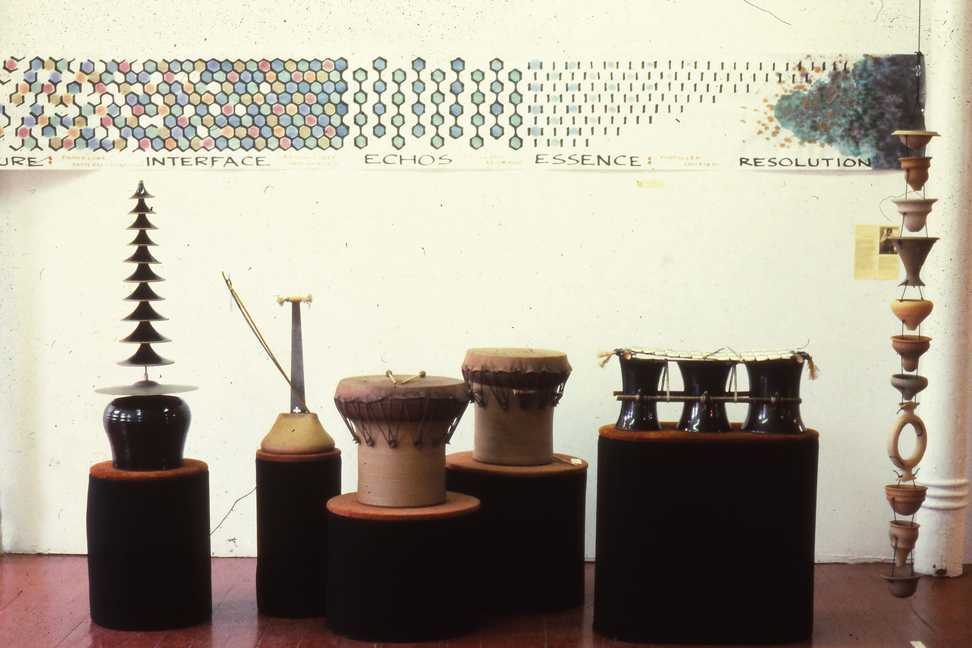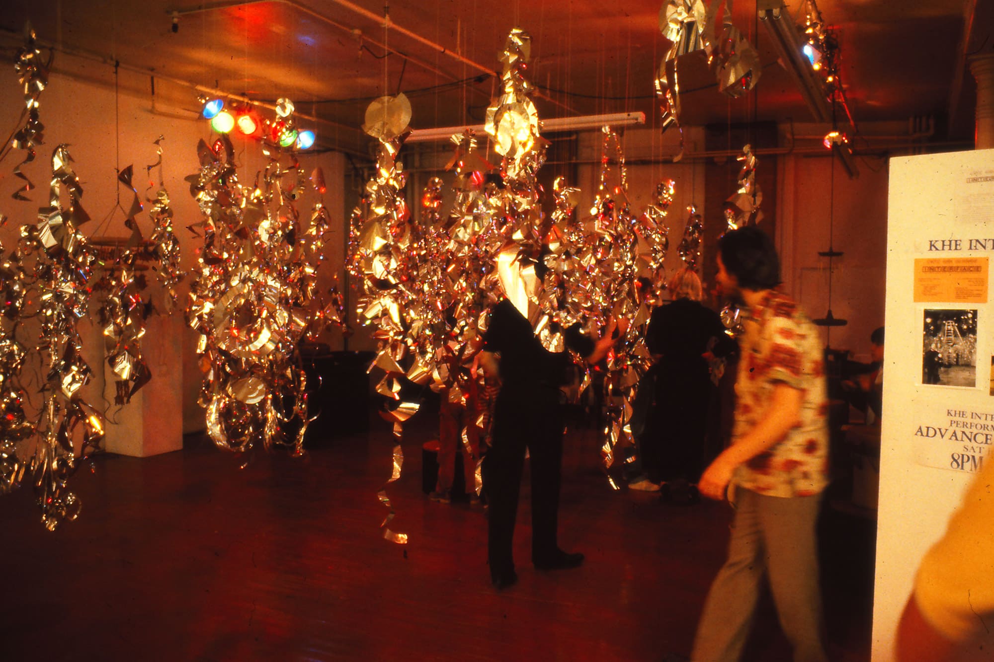 Interface is an environmental installation of silver mylar sculptures and two multi-media performances involving dance, voice, music, and lighting.