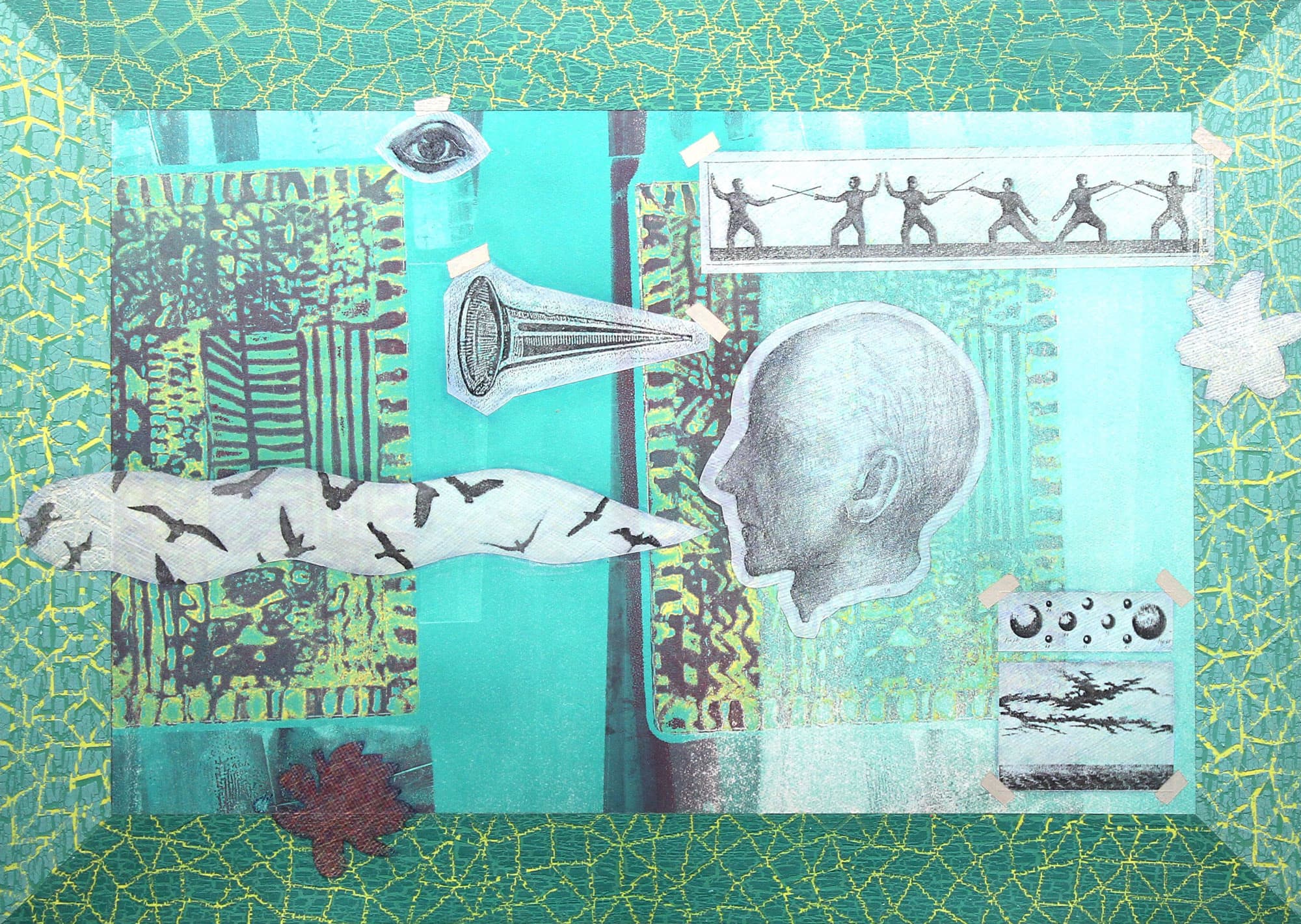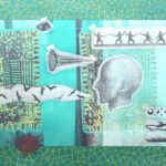 In these mixed media paintings on paper, Michael Harris seeks balance through the juxtaposition of found images with formal explorations and an attraction to less than conscious ideas.