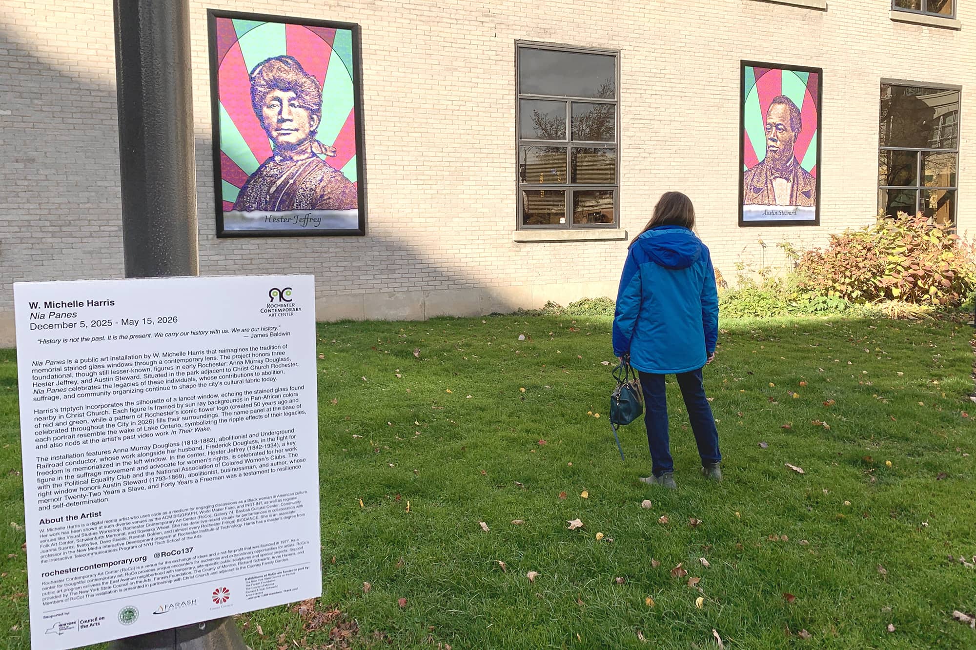 Nia Panes is a public art installation by W. Michelle Harris that reimagines the tradition of memorial stained glass windows through a contemporary lens. The project honors three foundational, though still lesser-known, figures in early Rochester: Anna Murray Douglass, Hester Jeffrey, and Austin Steward. Situated in the park adjacent to Christ Church Rochester, Nia Panes celebrates the legacies of these individuals, whose contributions to abolition, suffrage, and community organizing continue to shape the city’s cultural fabric today.