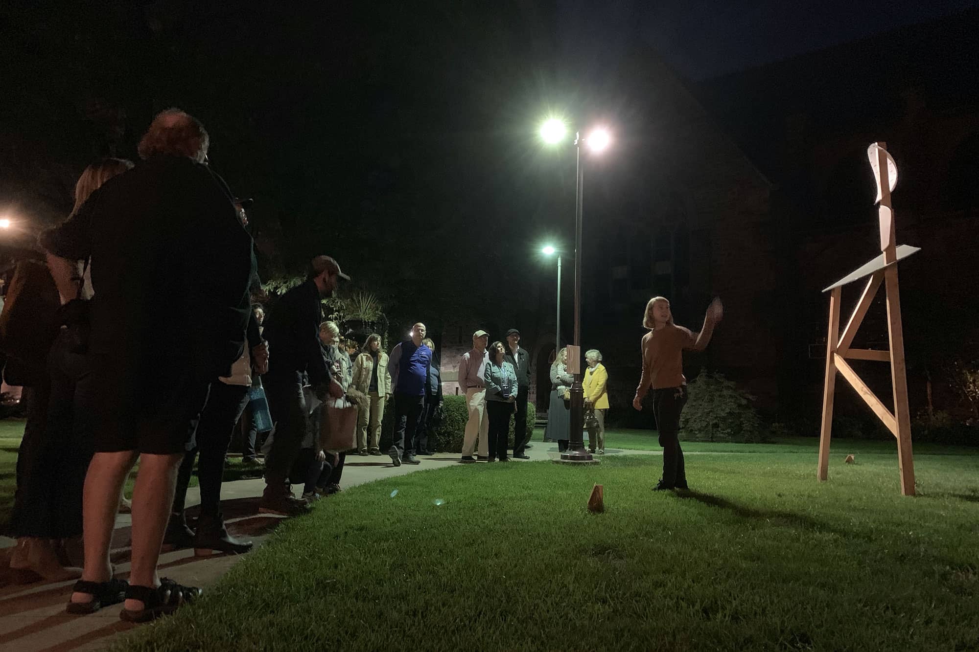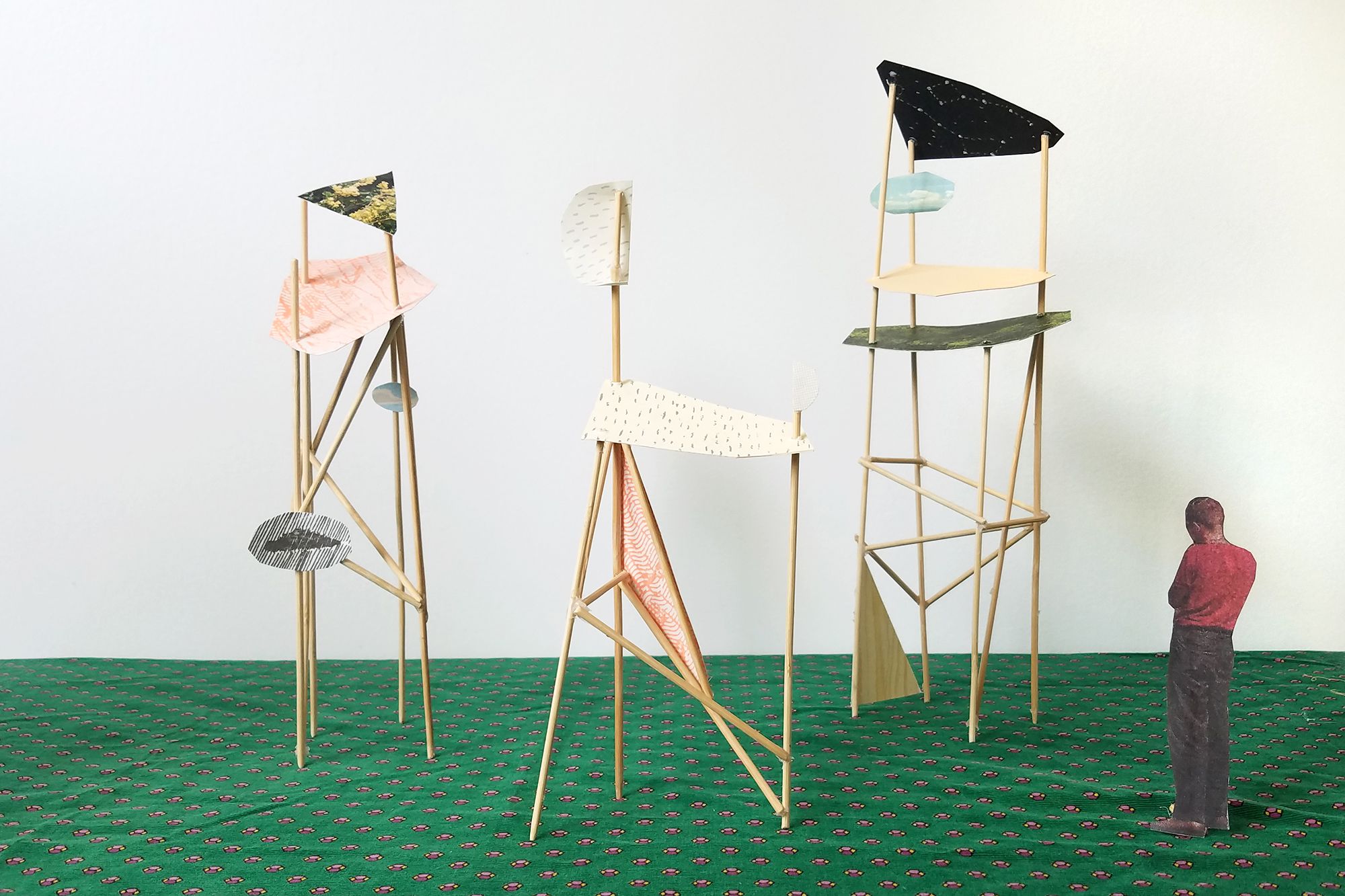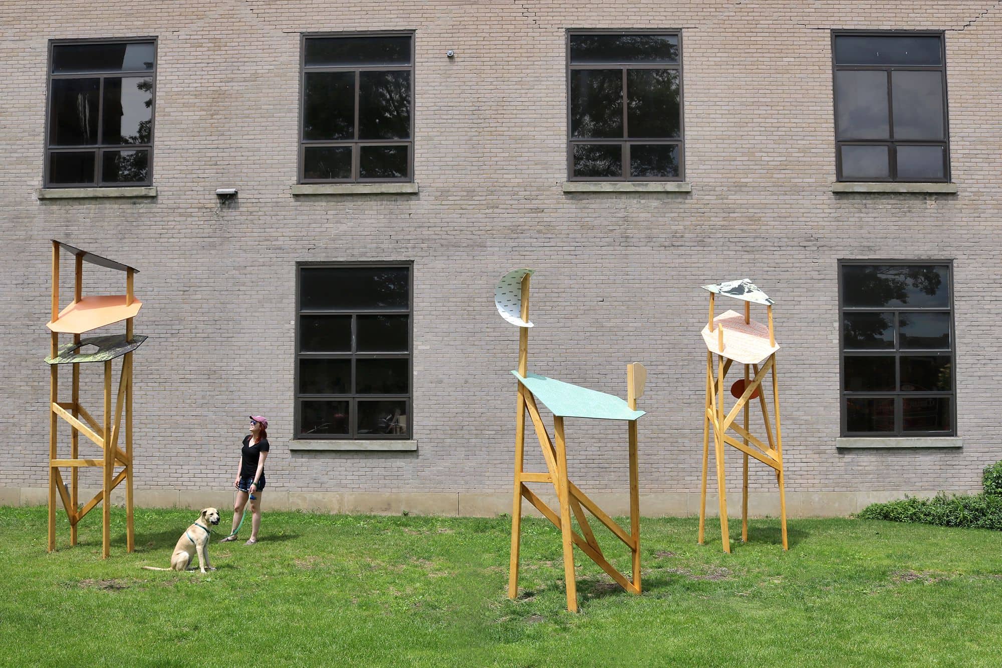 Heather Swenson's newest project Observation Towers combines the artist's interest in printmaking and sculpture and brings her work into a public space for the first time. Through mimicking parts of their surroundings while simultaneously pulling visual information from other spaces, these structures investigate sense of place. Observations are layered on a temporary, playful scaffolding to encourage familiar patterns, colors, and textures to interact in new ways. Observation Towers create a unique way of viewing one's surroundings by highlighting particular aspects of the space on a scale that the visitor and the passerby can physically relate to. Viewers are encouraged to walk around and underneath the structures, integrating themselves into this new habitat formed from parts of different places and surfaces.