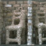 Ossification is an installation by Lyn Parsons as part of the Cultural View: Windows in Rochester project, in which the Sibley Center donates illuminated window space in return for one-year commtiments from various institutions to fill the window with their own professional displays. Parsons' installation deals with issues of anxiety, fear, and the way human tissue stiffens to protect itself from pain. It features two ceramic chairs and a brick wall made from afghans, which have been dipped in porcelain slip and fired.