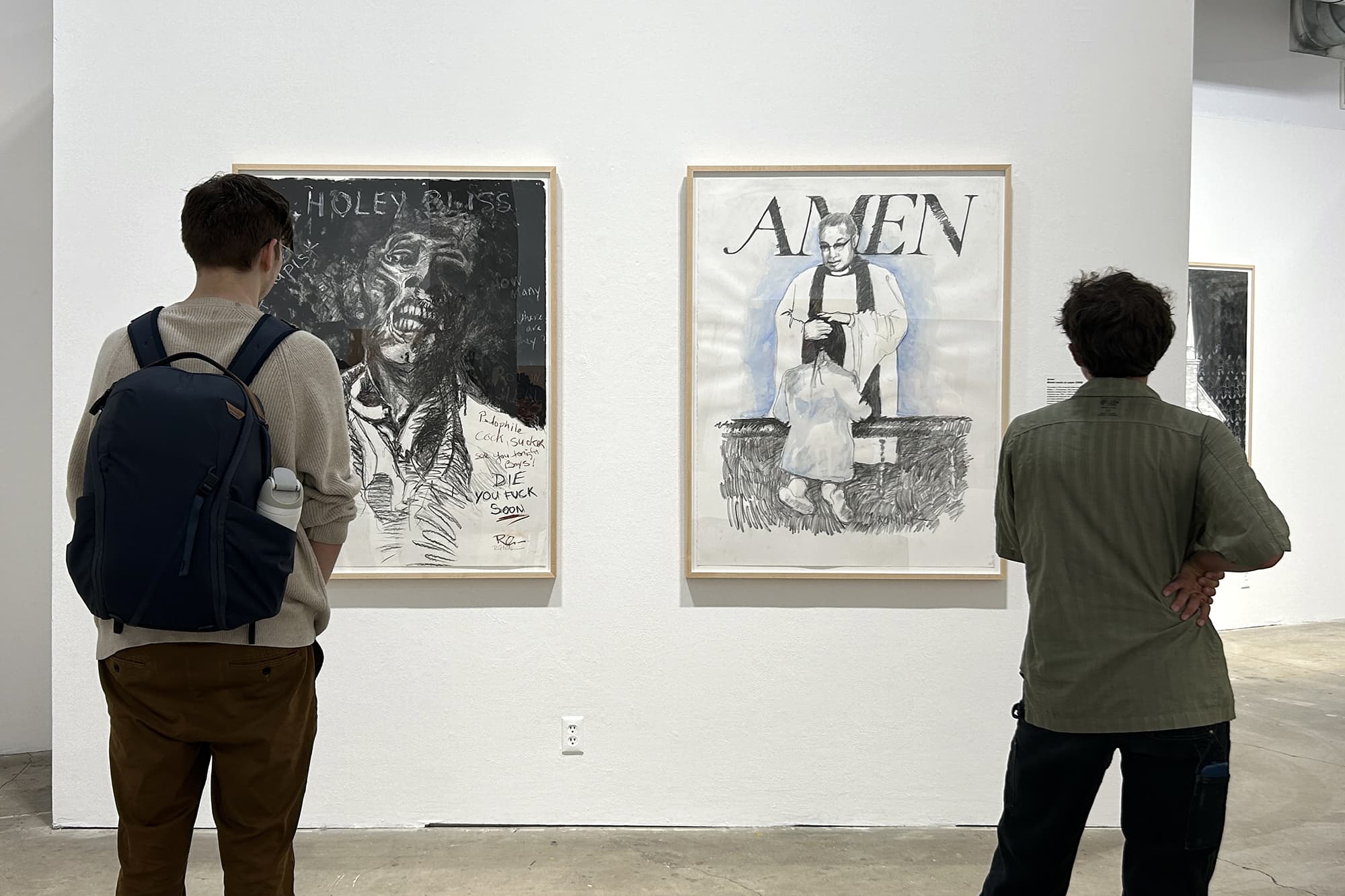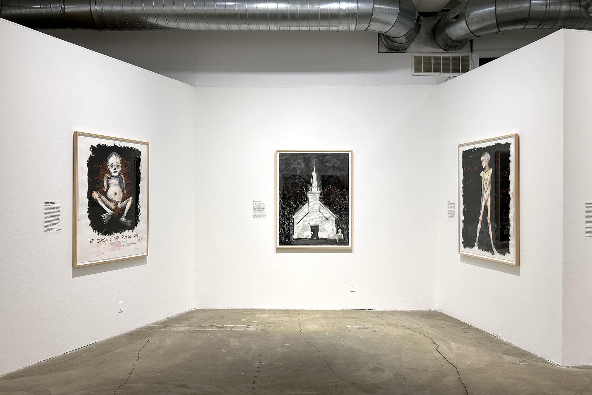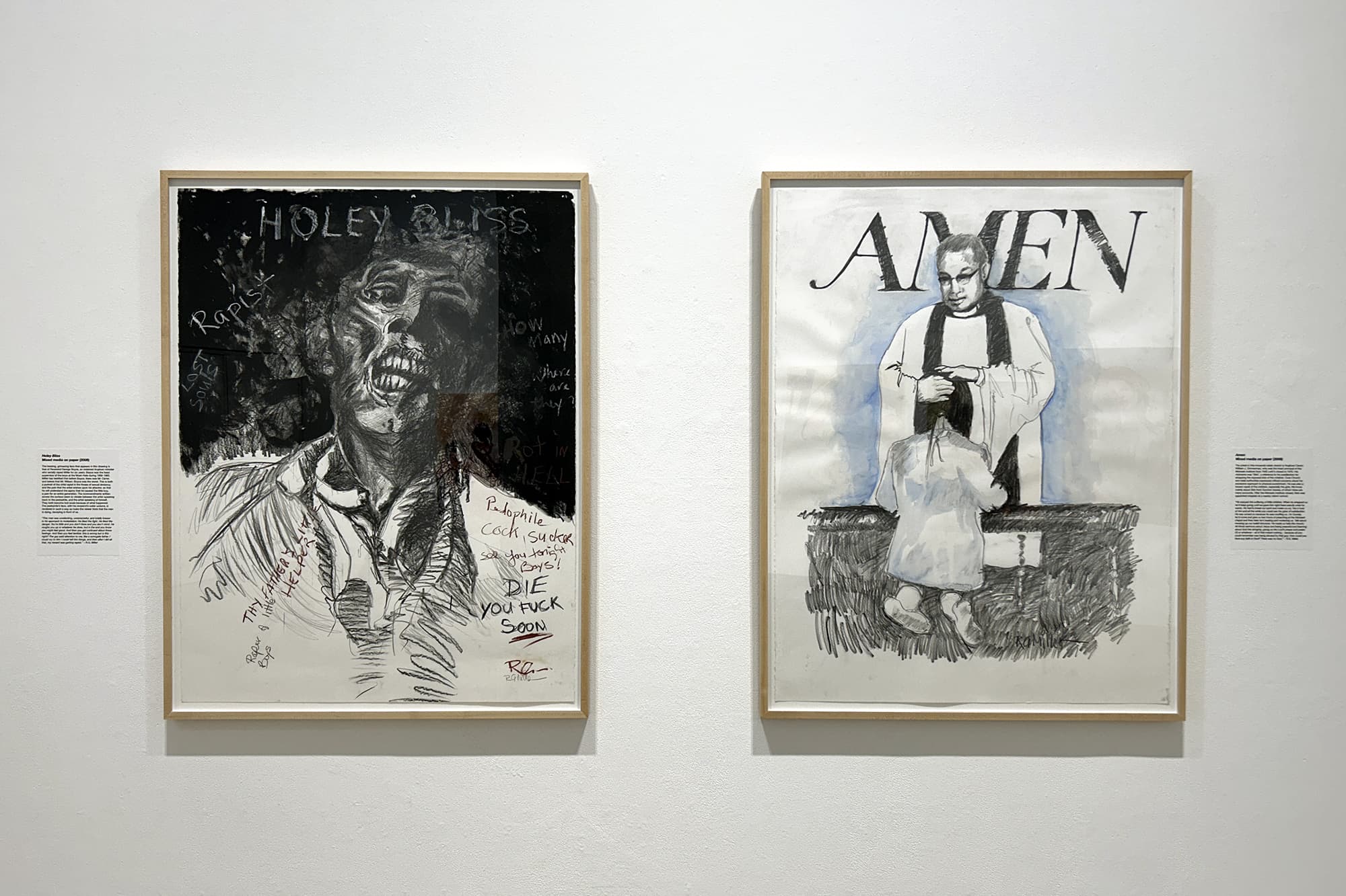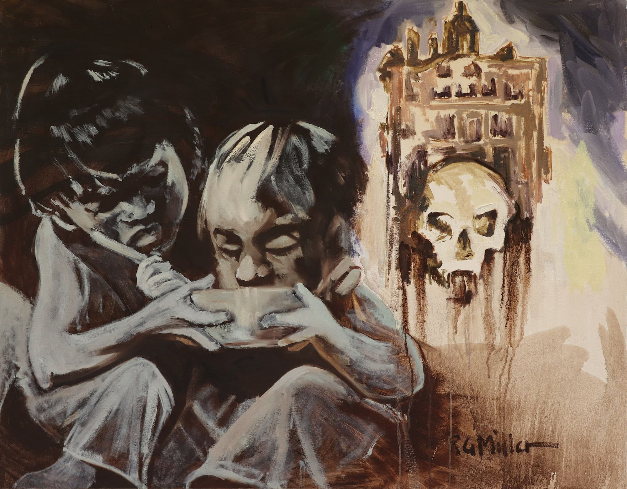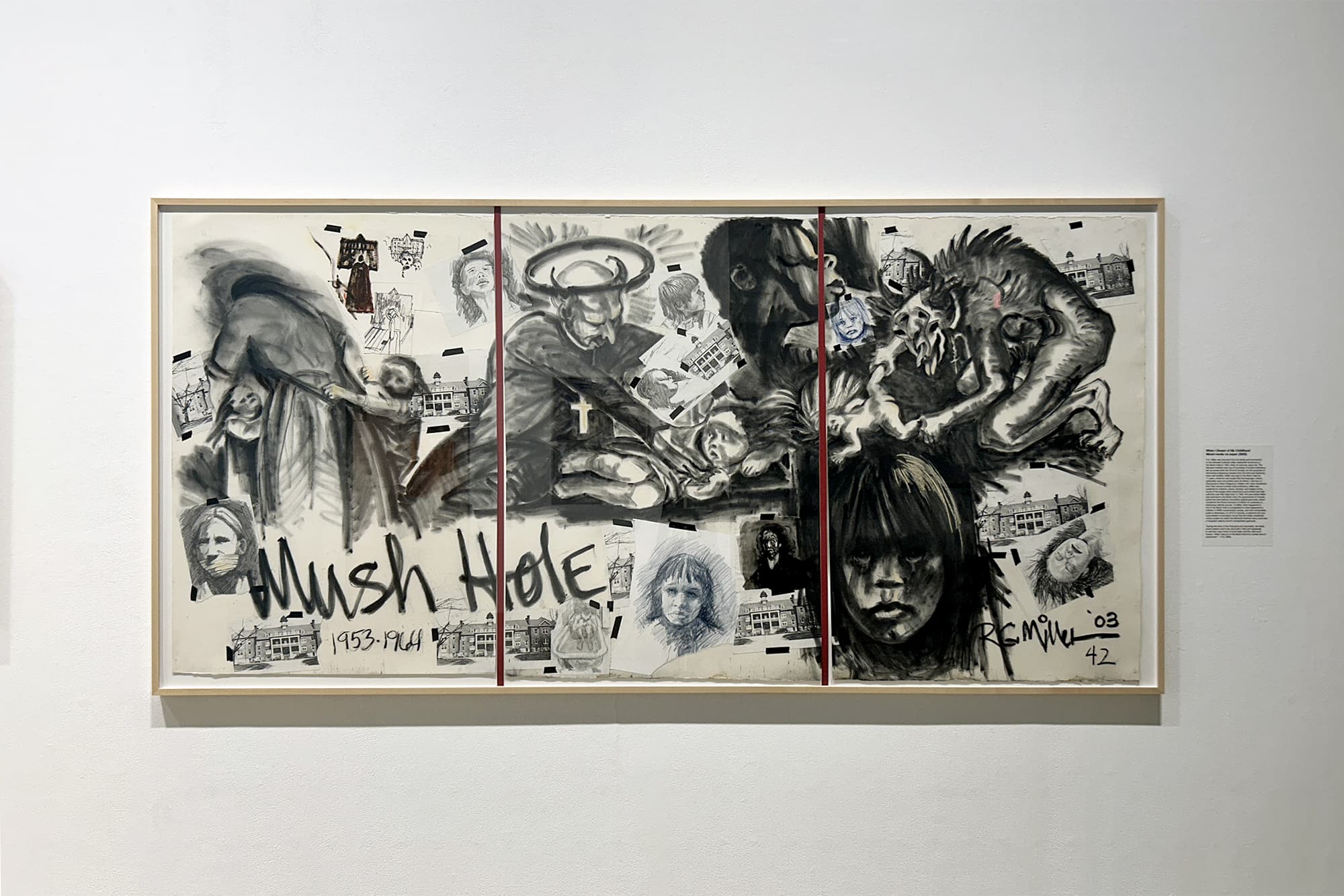 Along with hundreds of thousands of other Indigenous children across North America, R. G. Miller was forcibly removed from his family and community and put into an institution that Canadian officials proclaimed was intended to “kill the Indian in the child.” In the American version of these institutions the motto was “kill the Indian, save the man.” In addition to being deprived of his language, culture, security, nutrition, love, freedom, and community, Miller was subjected to chronic terror and abuse by the priests that administered the so-called ‘school.’ The exhibit includes large oil paintings, mixed media sketches, and collages created by Miller during 2003-2008. This project is intended to show the truth about these “death houses”.