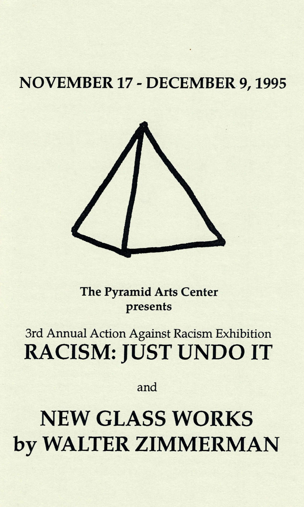 Racism: Just Undo It is the third annual Action Against Racism exhibition, which uses the arts to focus the community's attention on the need to promote racial harmony. The exhibited works include ceramic and wire sculptures, paintings, drawings, photography, and mixed media wall hangings.