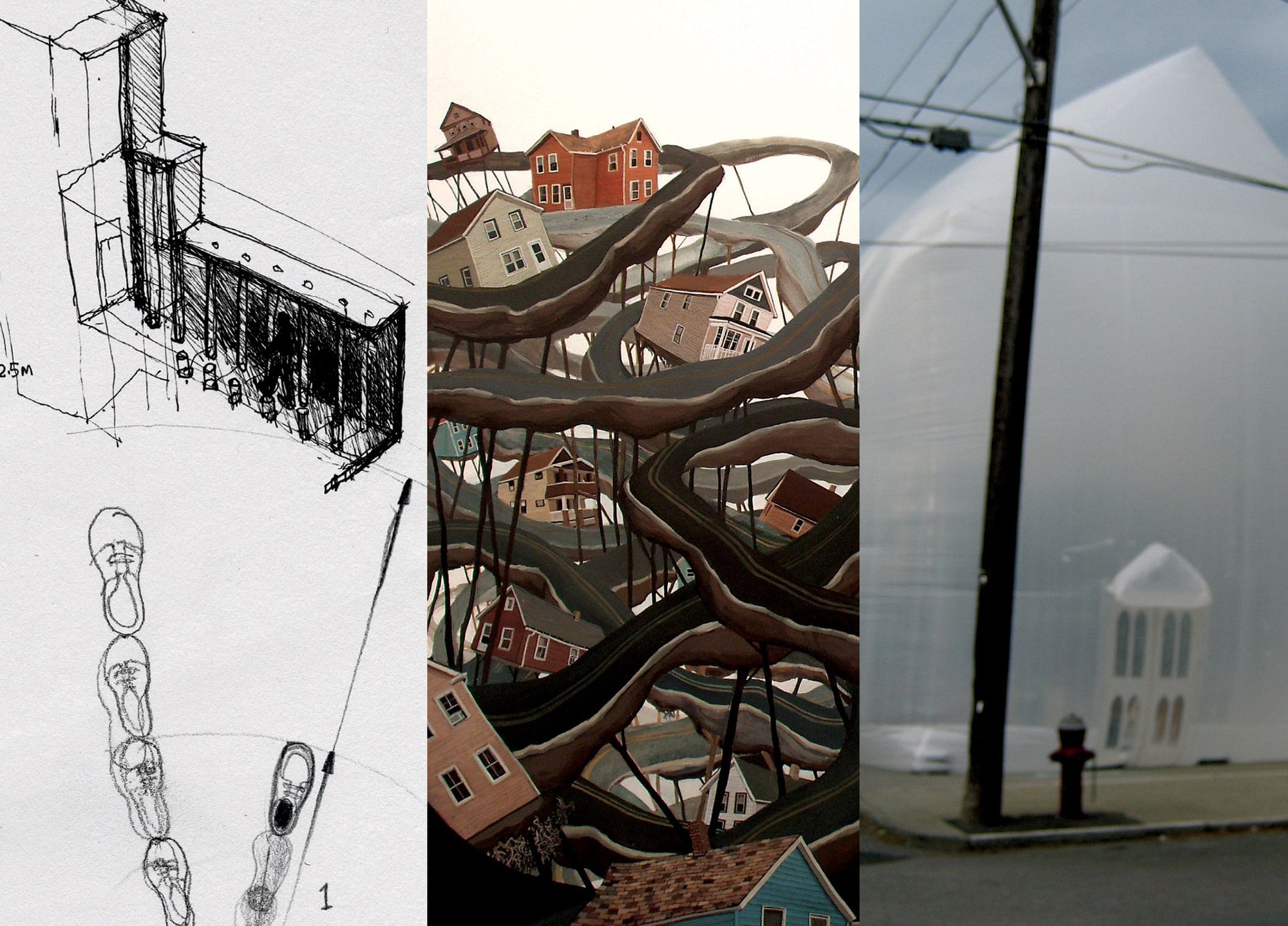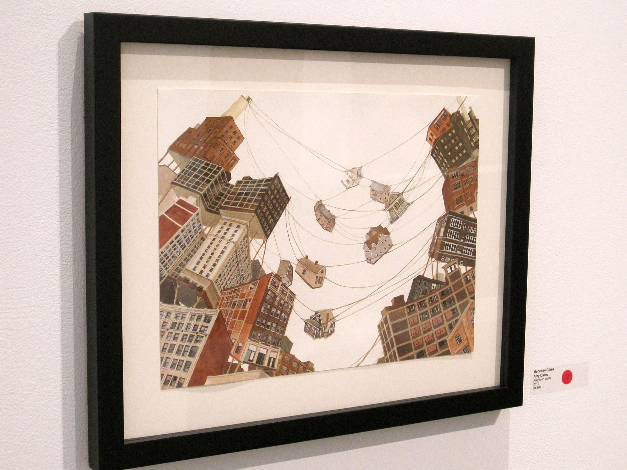 Amy Casey's small detailed paintings present fantastical and impossible urban landscapes. These intriguing and scary rust belt zones, residential, and industrial structures take on personality, muster their collective humanity, and seem to be fighting for their own life. From what? Though optimism and playfulness can be found, it all seems to be teetering on the brink. It is no surprise that Casey's work is "inspired by natural and unnatural disasters, personal fiascoes and the never ending stream of bad news coming in from the media..."