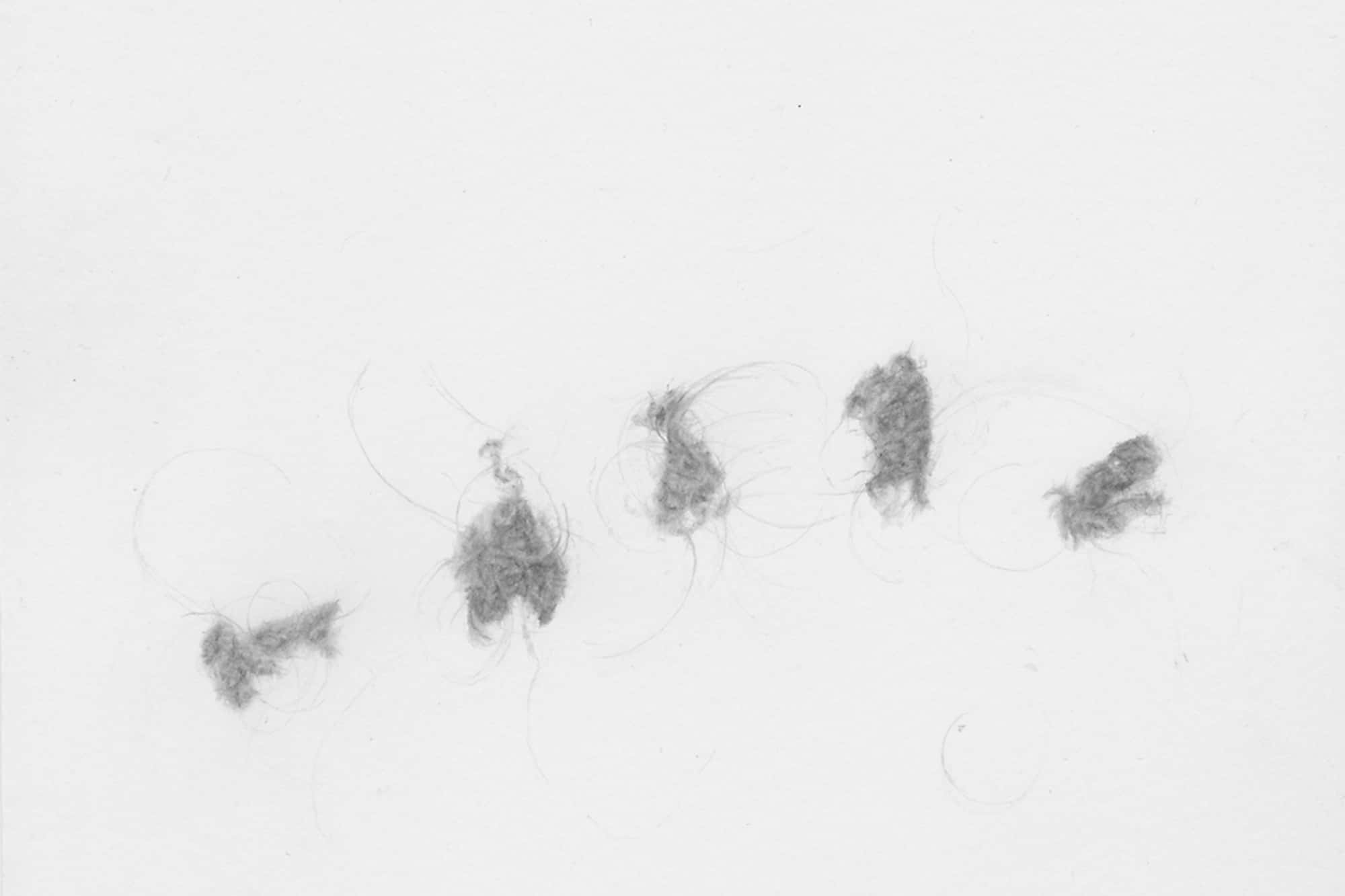 Card's Sweepings is an intimate examination of detritus. Debris, dust, lint, and hair accumulate—in corners, under furniture, or in the drain—until they are casually swept up and discarded. The drawings in Sweepings reveal the intricate beauty of these detrital objects, waste shed by the body or left to decay. They simultaneously animate and arrest the intimate, if overlooked, evidence of our inevitable disintegration.