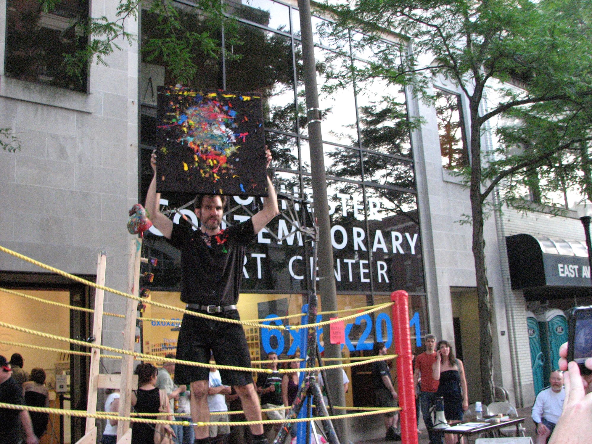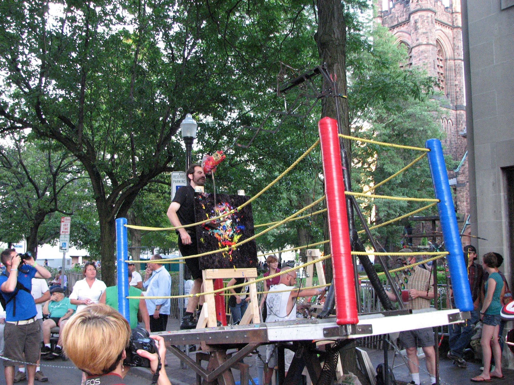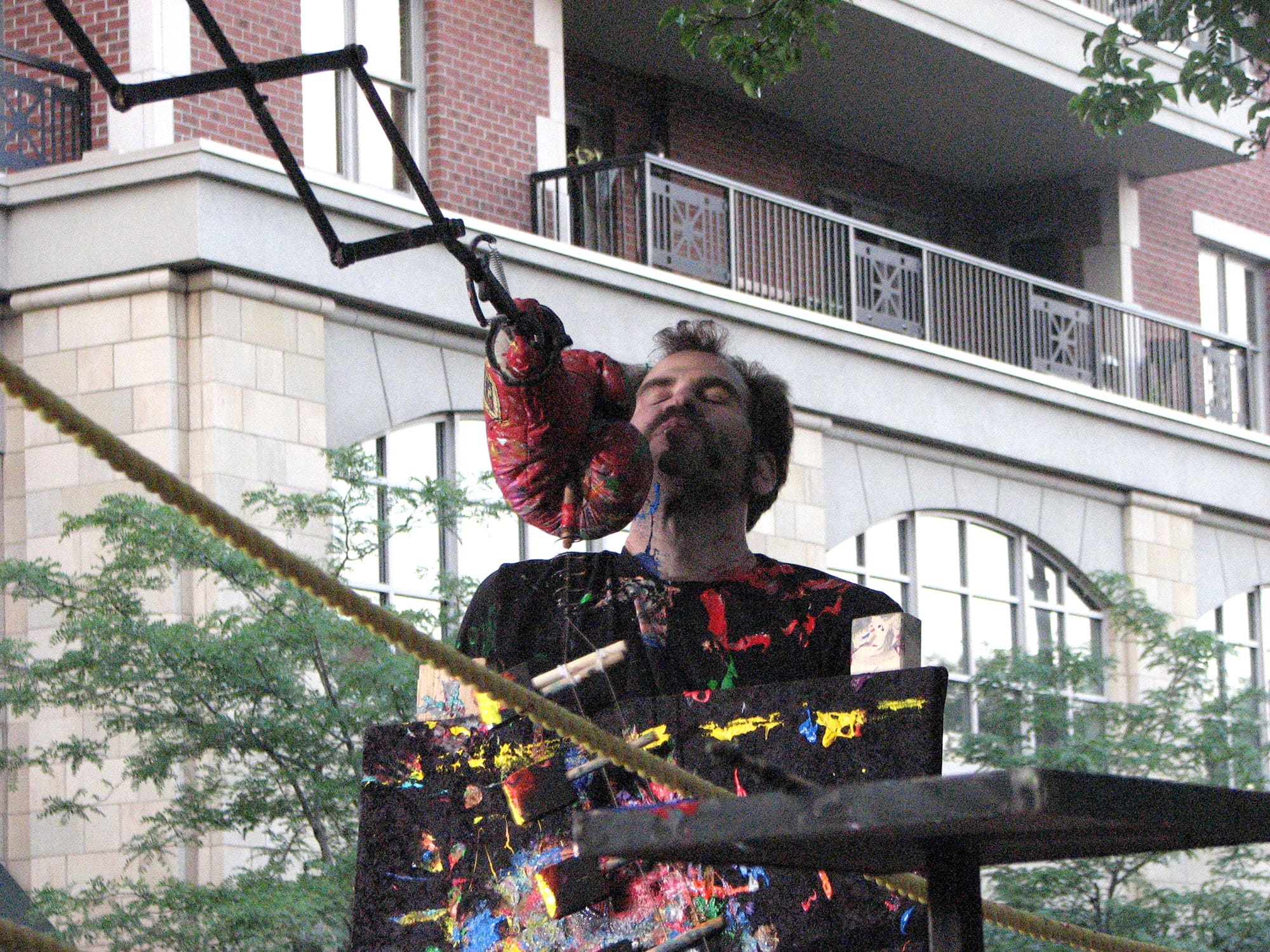 Abraham Ferraro battles with his mechanical spring-loaded boxing machine, repeatedly getting punched in the face. Each blow leaves a mark, creating an abstract painting. The artist's 4’ x 11’ ring is a kinetic sculpture, complete with turnbuckles and ropes, teetering up and down. Ferraro is accompanied by a Ring Master, Round Girl, and "Paint Guy."