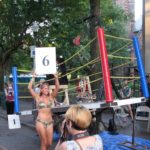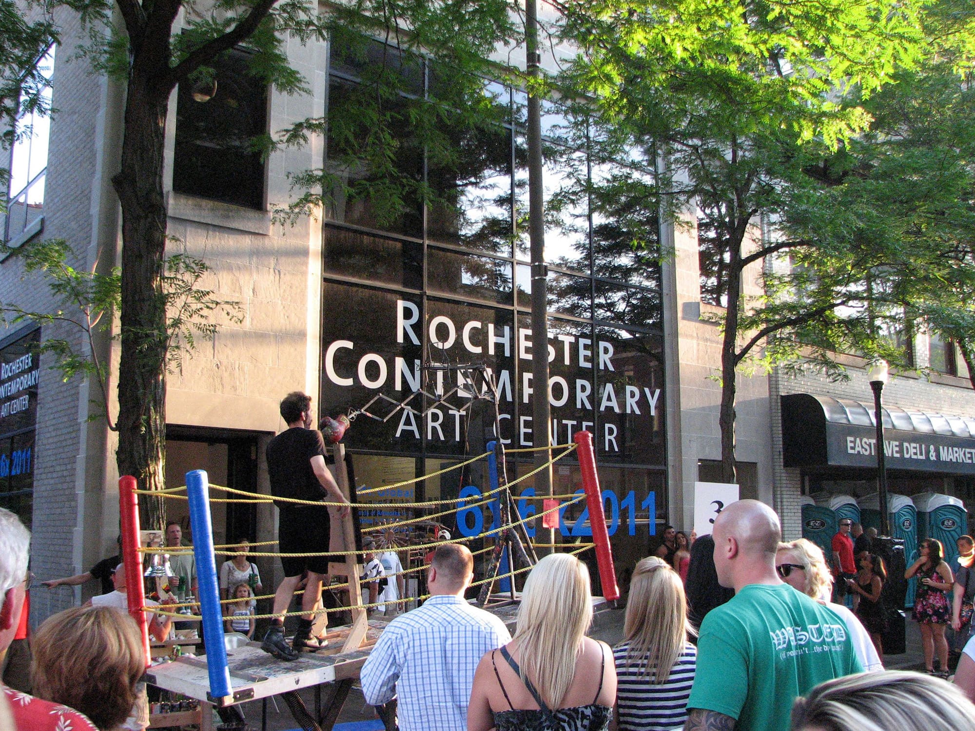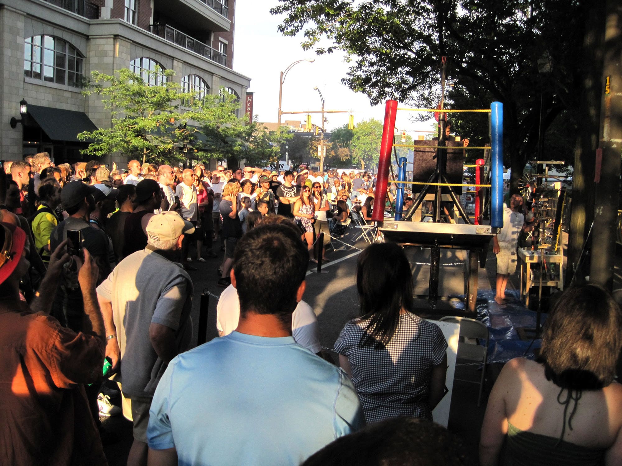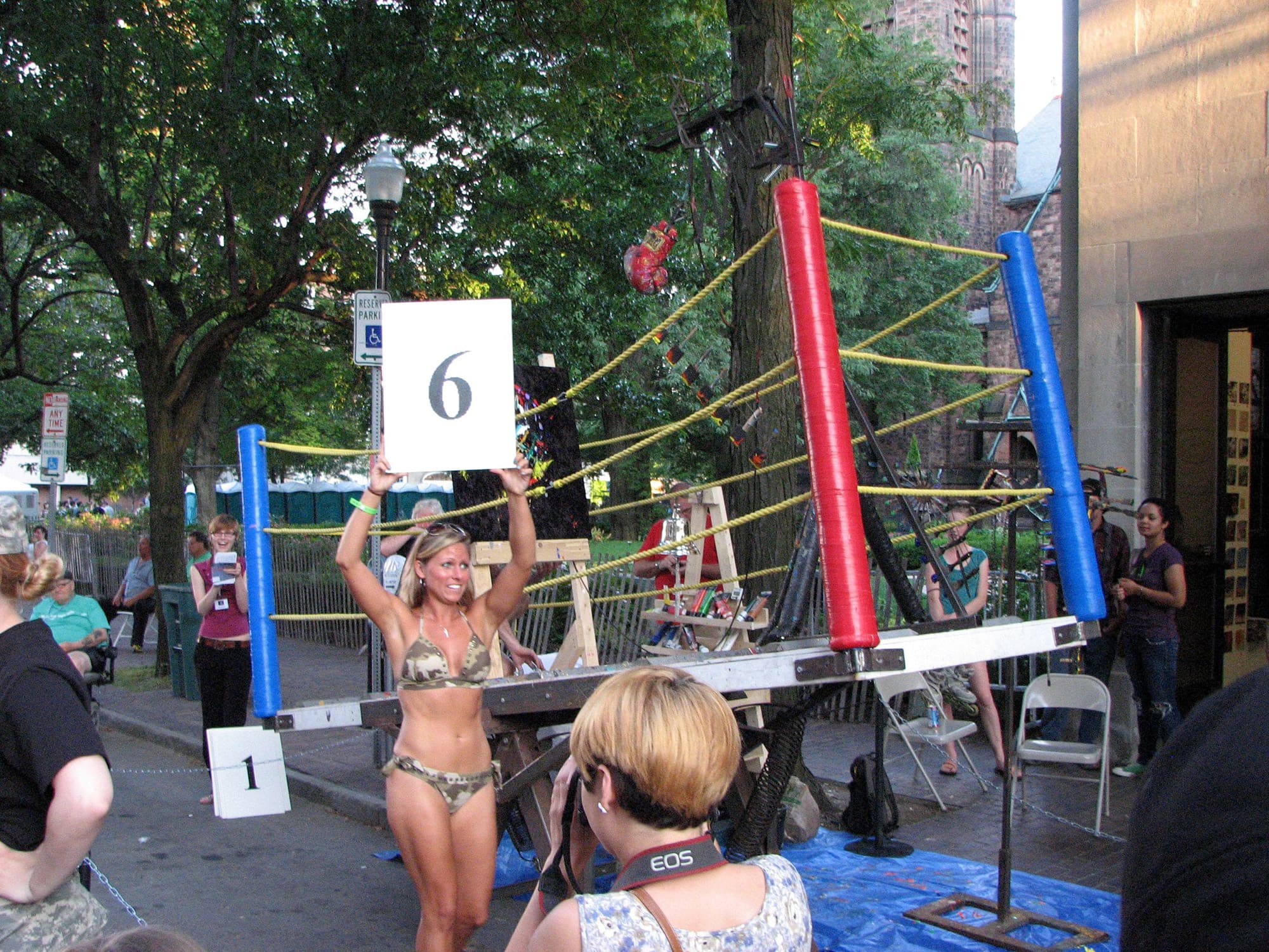 Abraham Ferraro battles with his mechanical spring-loaded boxing machine, repeatedly getting punched in the face. Each blow leaves a mark, creating an abstract painting. The artist's 4’ x 11’ ring is a kinetic sculpture, complete with turnbuckles and ropes, teetering up and down. Ferraro is accompanied by a Ring Master, Round Girl, and "Paint Guy."