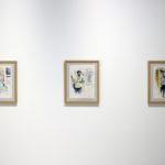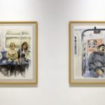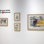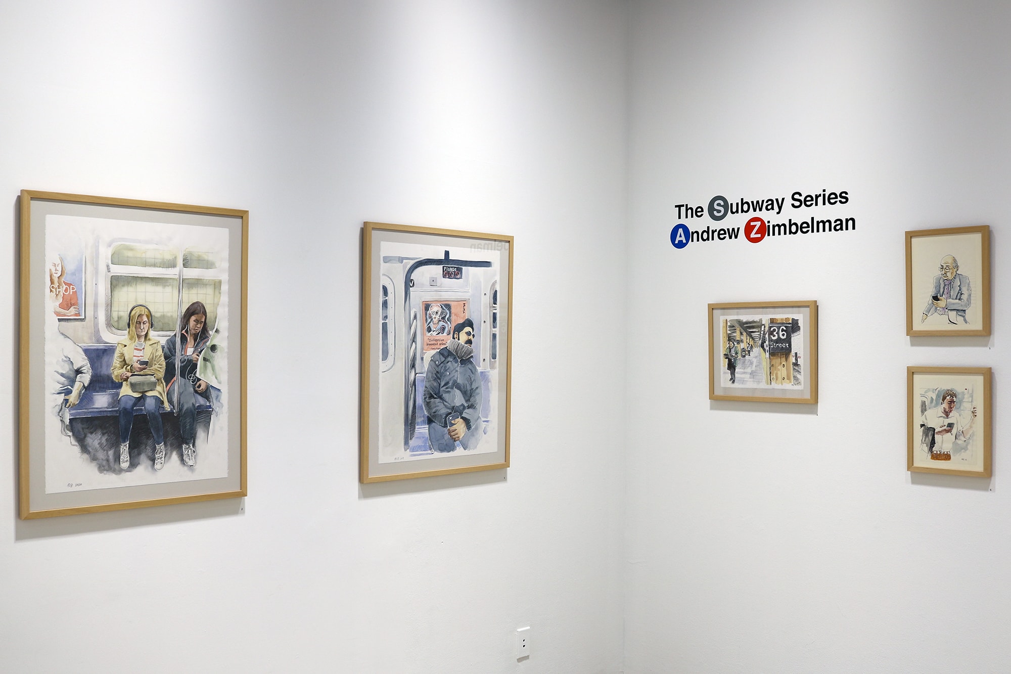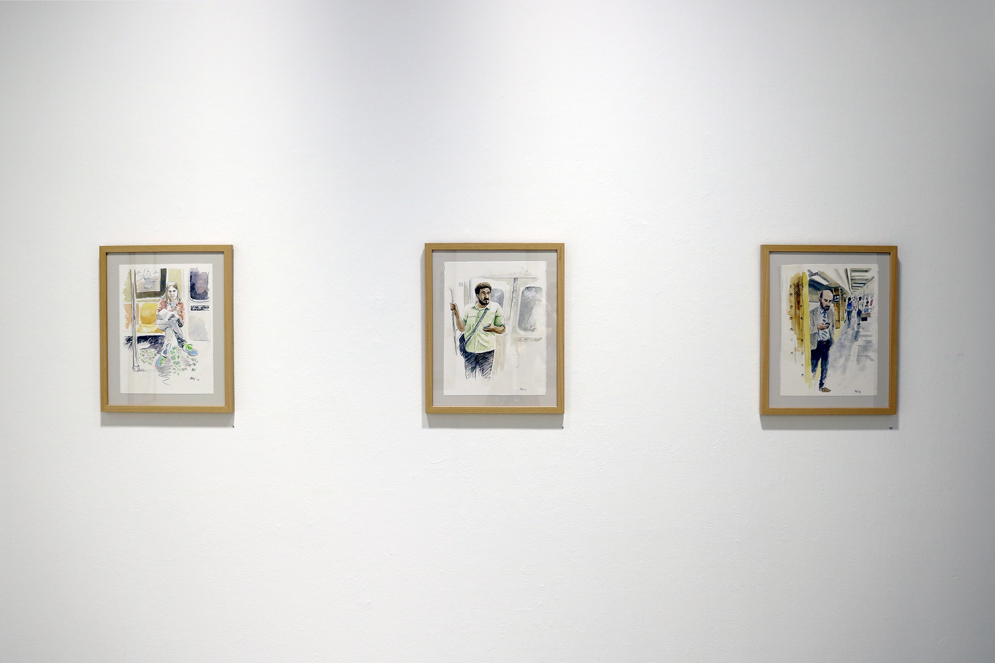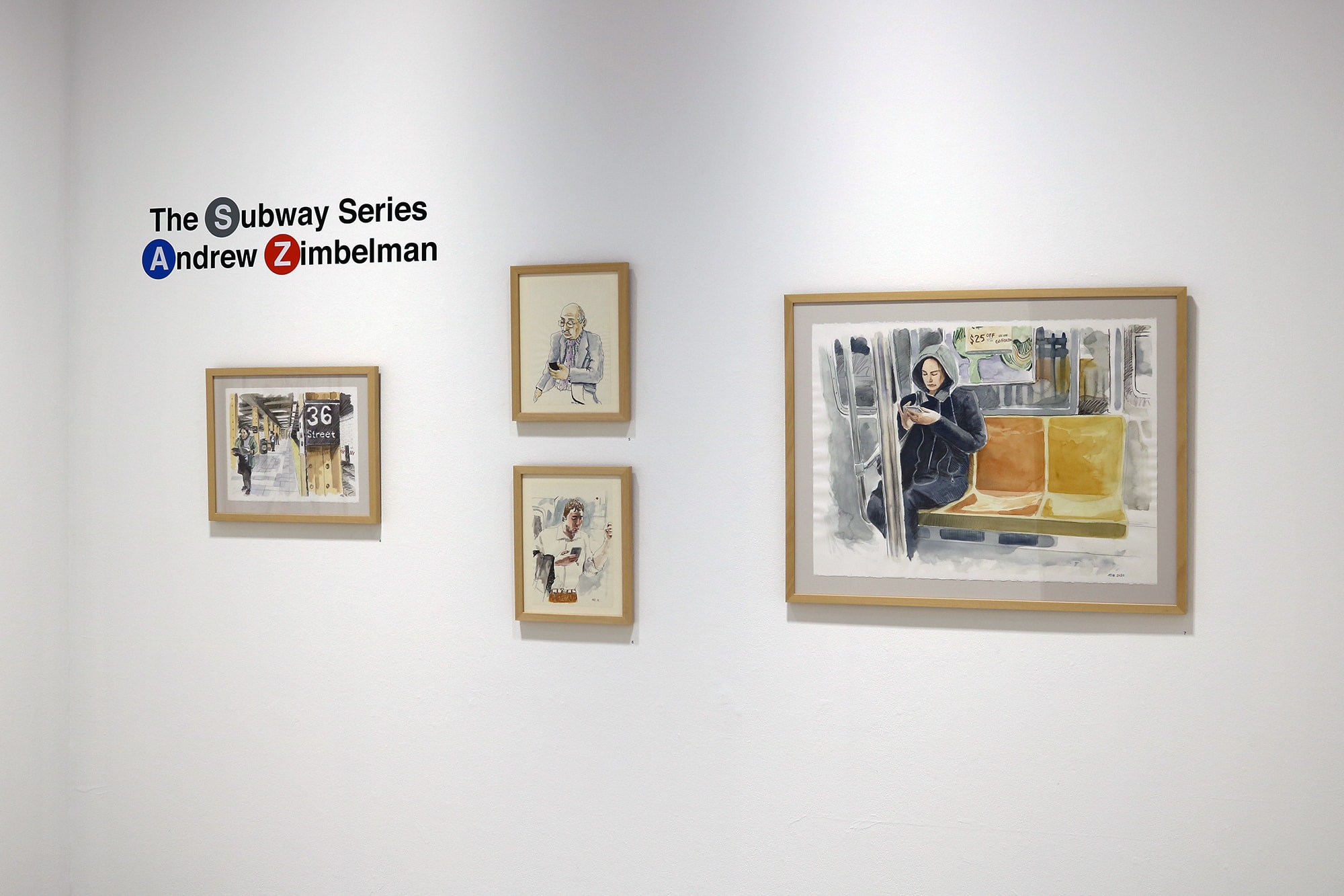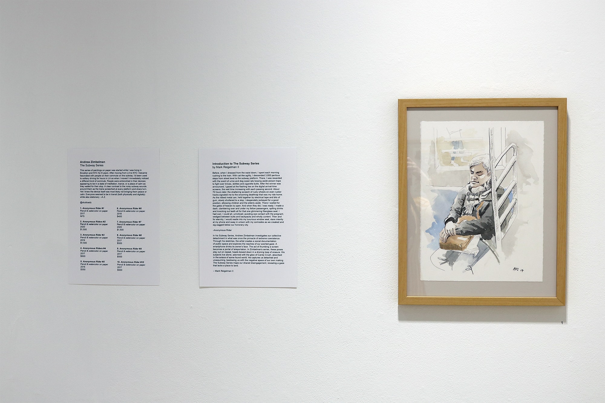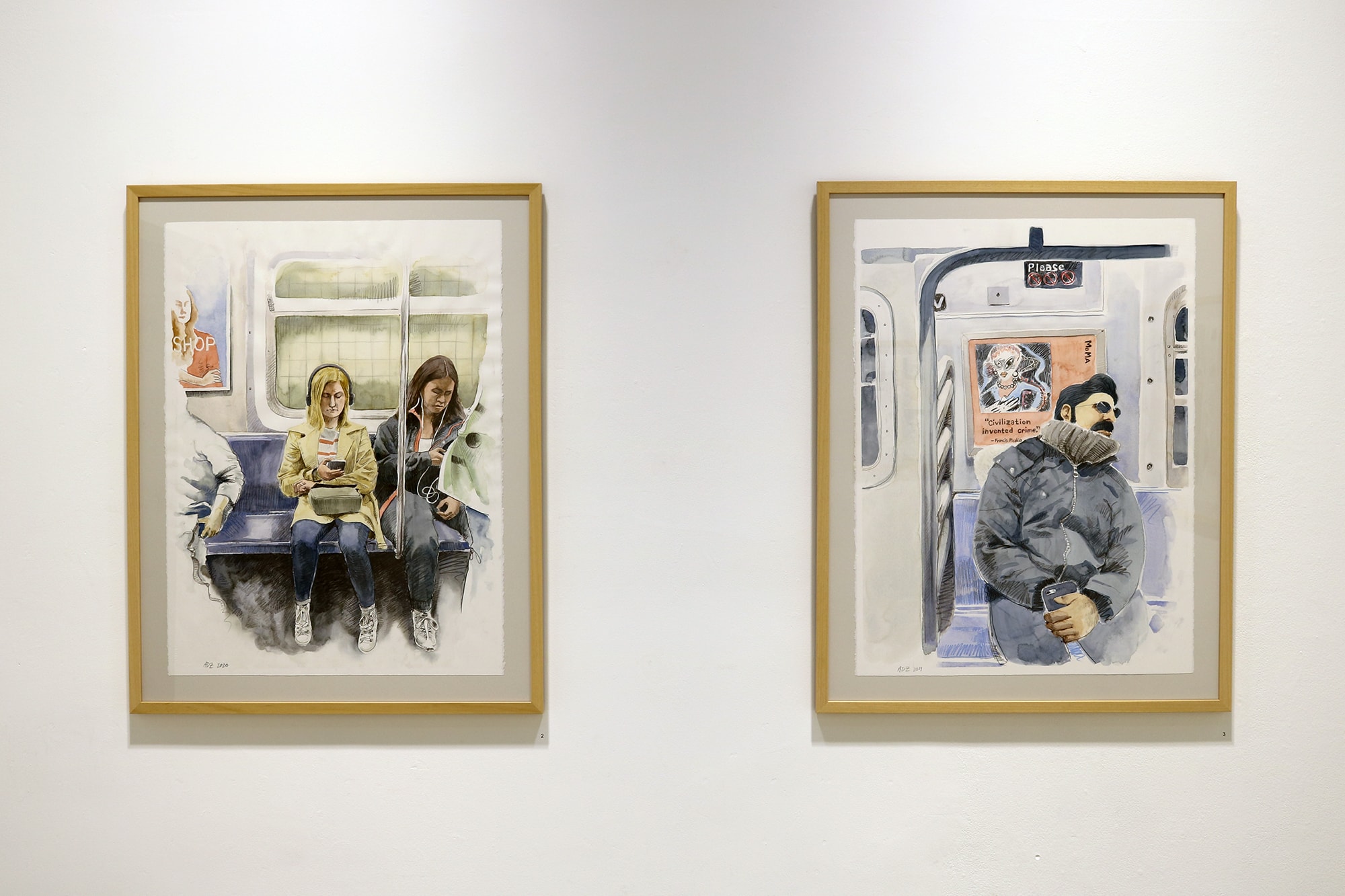 This series of paintings on paper was started while the artist was living in Brooklyn and NYC for 8 years. After moving from LA to NYC he became fascinated with people on their commute on the subway. I’d been used to solitary driving for hours in LA so when I moved I immediately noticed a different kind of commute. People were entrenched in their devices; appearing to be in a state of meditation, trance, or a place of calm as they waited for their stop. A clear contrast to the noisy subway sounds around them as the trains screeched at every platform and sharp turn. Yet I knew the device itself was most likely not bringing them peace or calm. Everyone seemed to be in transit ( both physically and digitally) while also stationary.
