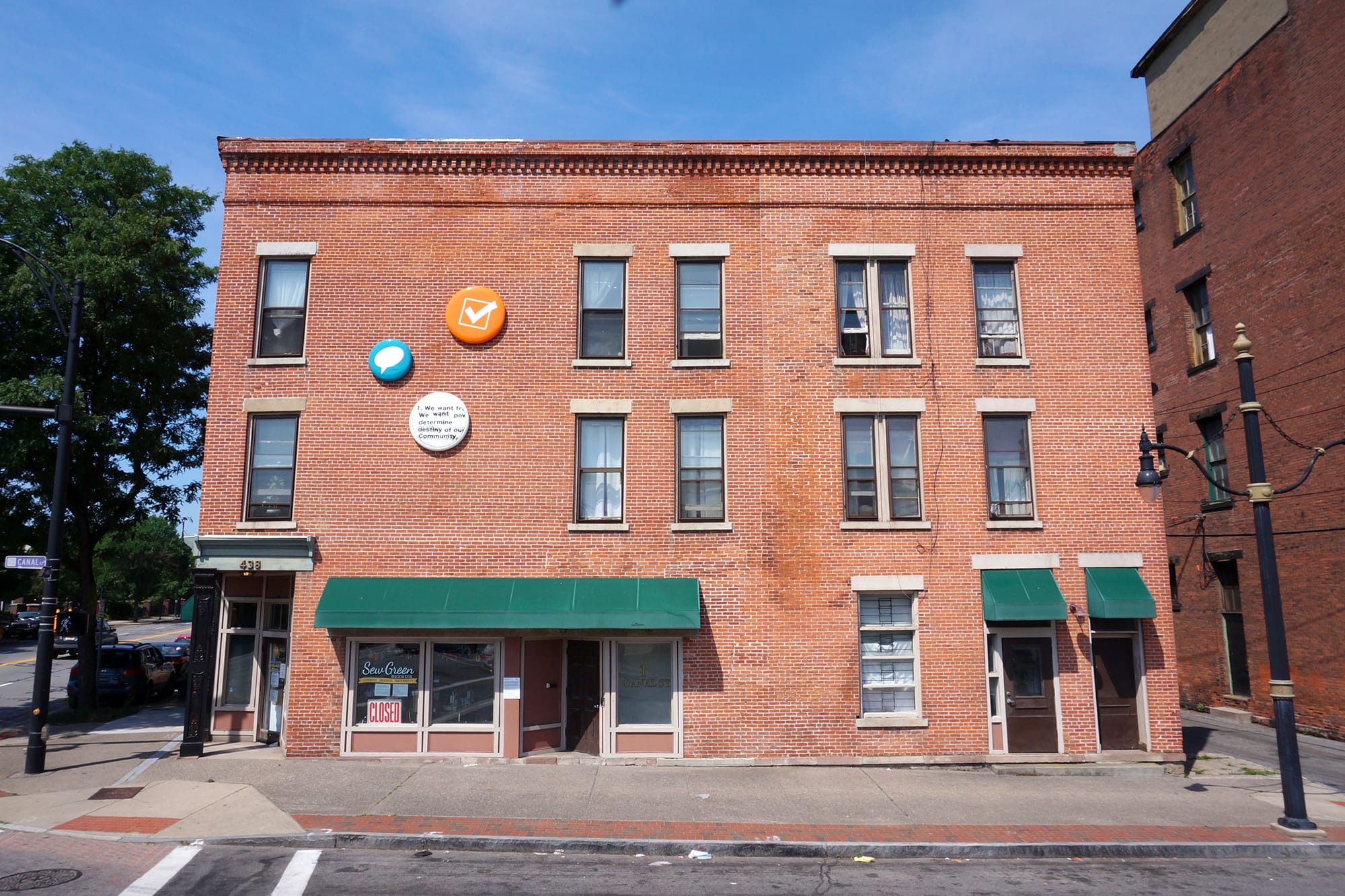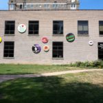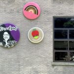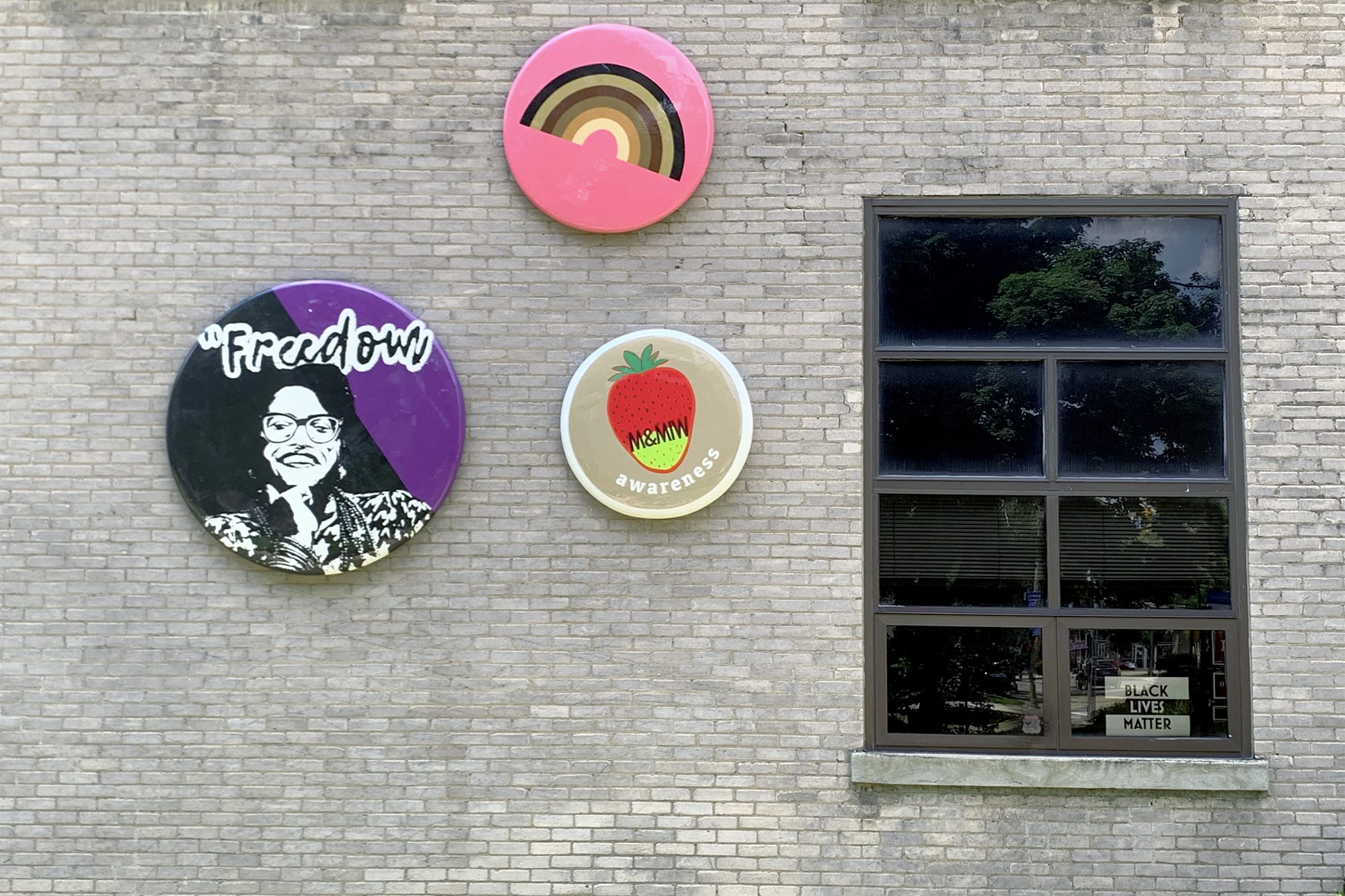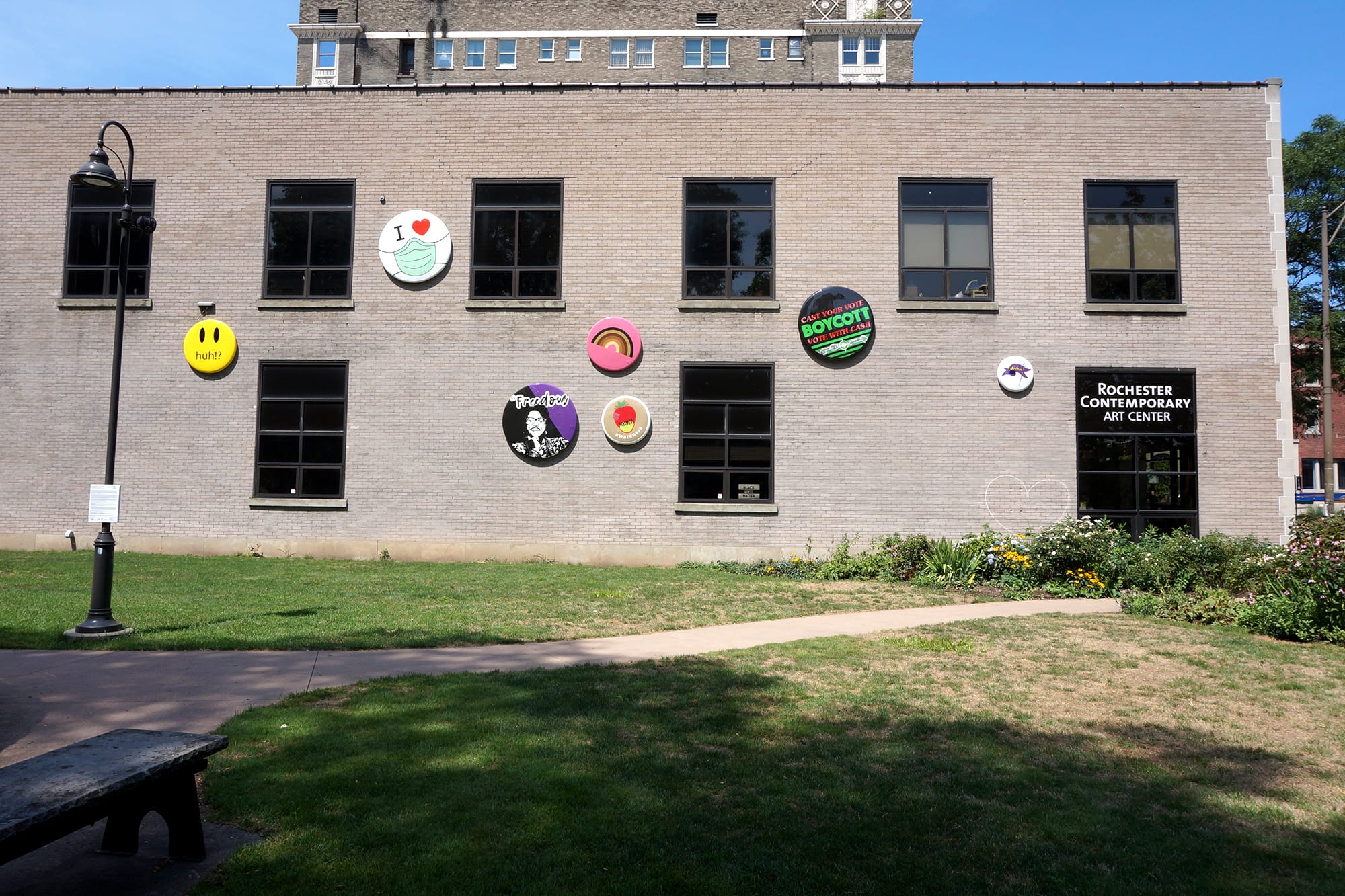 This public installation takes the form of oversized buttons that are proportionally scaled to ornament several Rochester buildings. Incorporating expressions, icons, sayings, and slogan, these buttons are affixed to several building facades between Rochester Contemporary Art Center (137 East Ave.) and Susan B. Anthony Museum and House (17 Madison St.), including 17 East Main St., Sew Green (438 West Main St.), and 36 King St. "Underpin and Overcoat" aims to unify the public, inspire action, bring joy, and create a space for viewers to insert their own messages and ideals. The work aims to help us discuss opposing views, ask questions, and find commonality in shared sentiments. During this critical political season, Underpin and Overcoat enlarges the intersection of jewelry, political history, and social justice on the streets – much as the Suffragists did themselves.