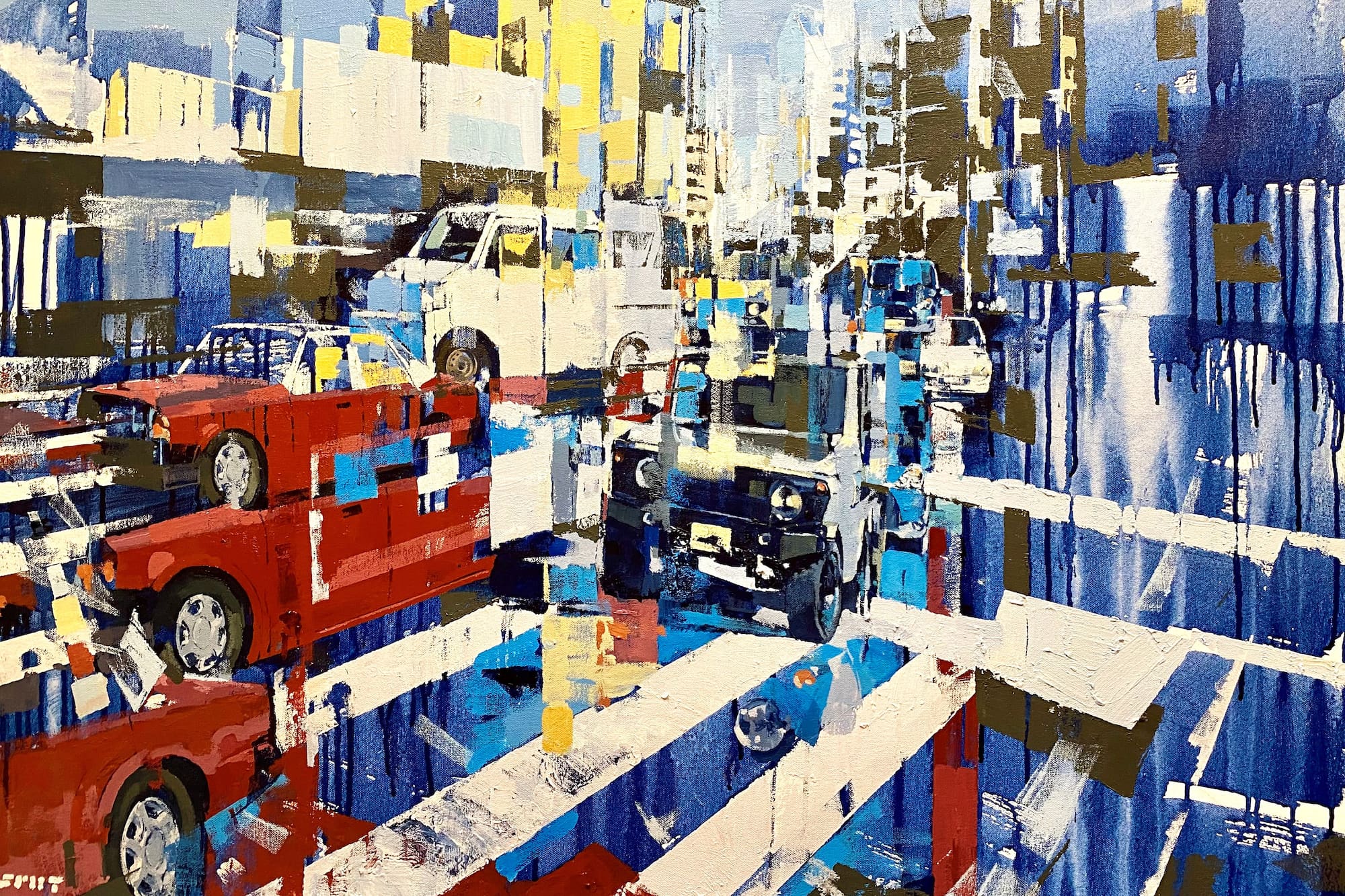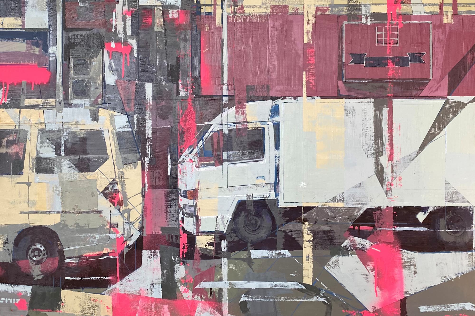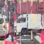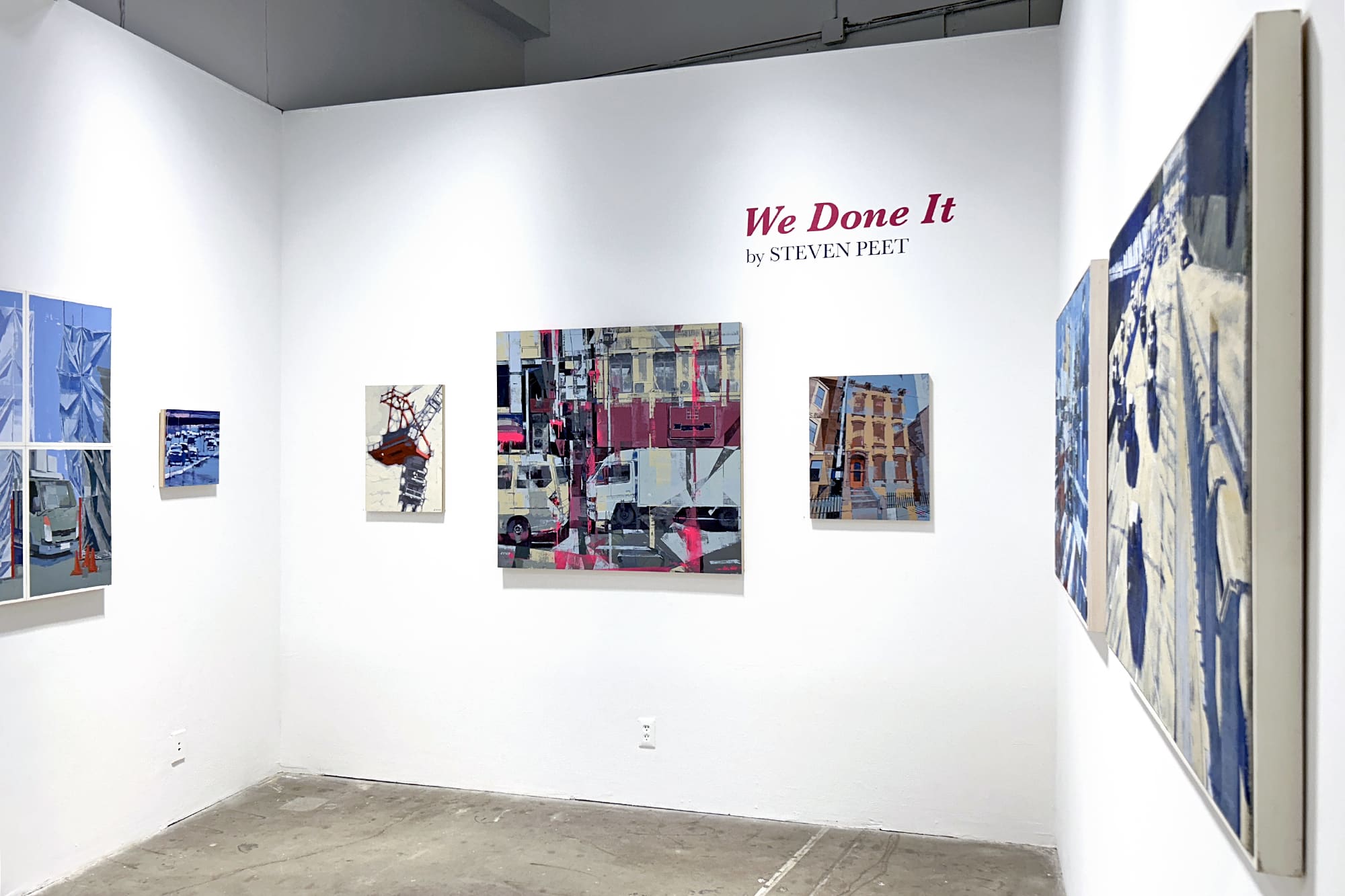 Steven Peet’s latest exhibition “We Done It” explores the fraught relationship between people, especially the artist himself, and the built environment. Drawing on his background as an architect and his experiences abroad, including a recent residency in Kyoto, Japan, Peet interrogates the tension between abundance and efficiency in contemporary urban spaces. Through his acrylic paintings on canvas and paper, Peet crafts layered compositions that reflect on the unsettling and often chaotic nature of development and cities. His artwork and creative process question whether these environments, and their apparent disregard for nature, are the products of careless design or are “intentionally hurtful”. By connecting pictorial space with narrative potential, Peet’s evolving body of work challenges us to consider: are we the makers of our surroundings, or merely their output?