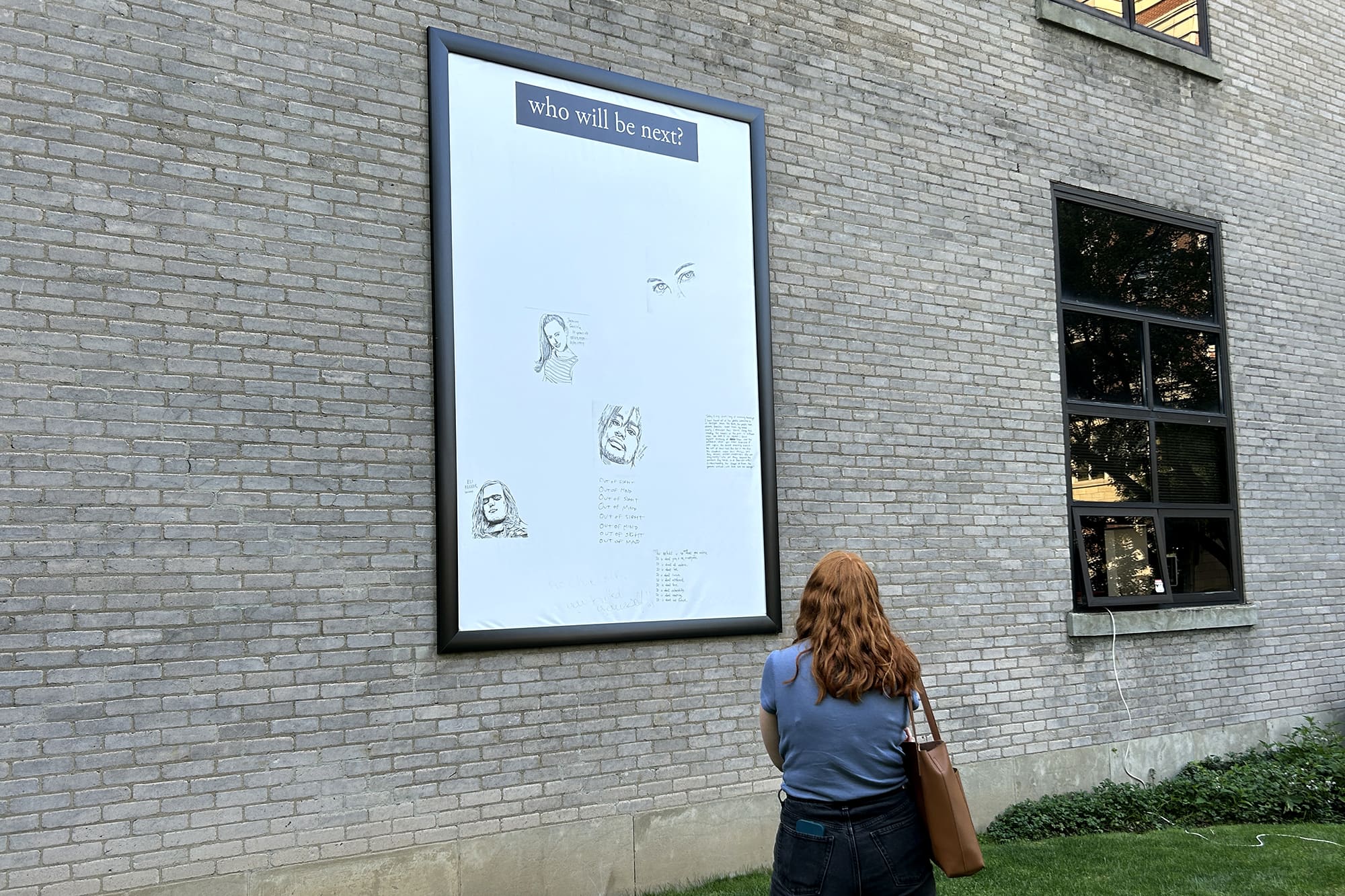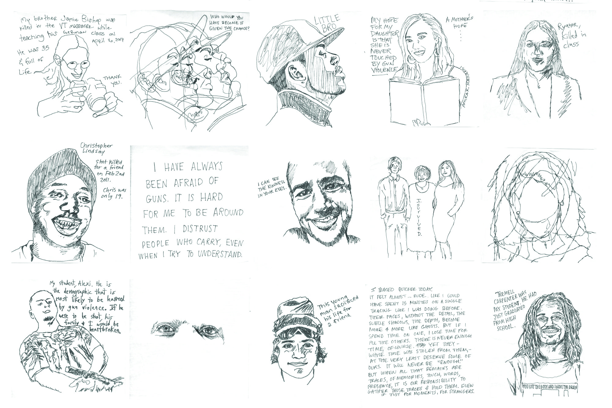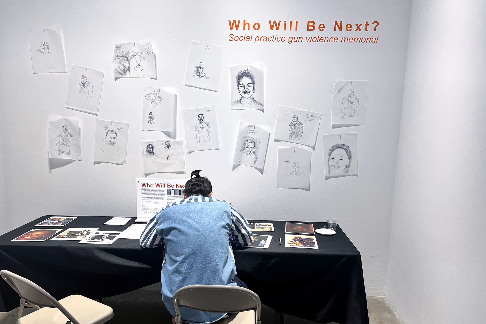 "Who Will Be Next?" is an ongoing social practice project created by collaborators Martin Krafft and Elena Makansi. Started six years ago in Tucson, AZ, this project has evolved through multiple iterations to invite gun violence survivors from around the country to share images with their loved ones to be traced in acts of ritual mourning. Throughout the process, Krafft and Makansi seek to center the experiences of those most harmed by gun violence. In order to make space for creative empathy, participants were also invited to trace photos of their loved ones and consider them as potential victims of gun violence.