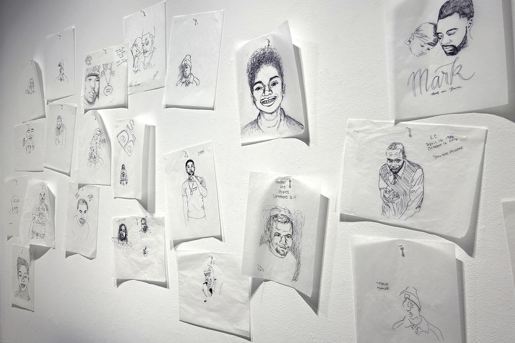 Inside RoCo: Visitors are invited to trace photographs submitted to the project by gun violence survivors. As this project is an act of ongoing community creation, visitors are welcome to send their images to director@martinkrafft.com.