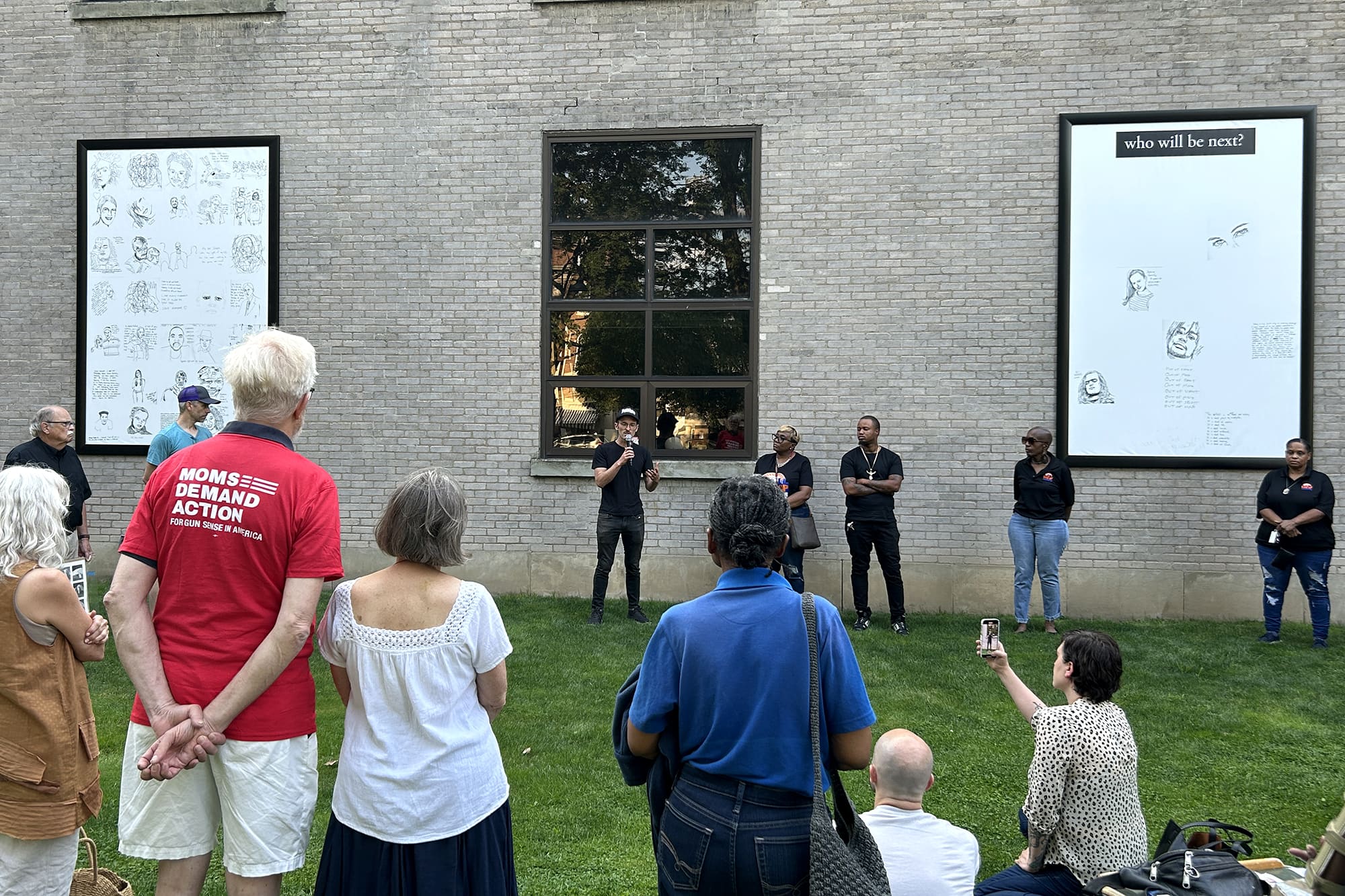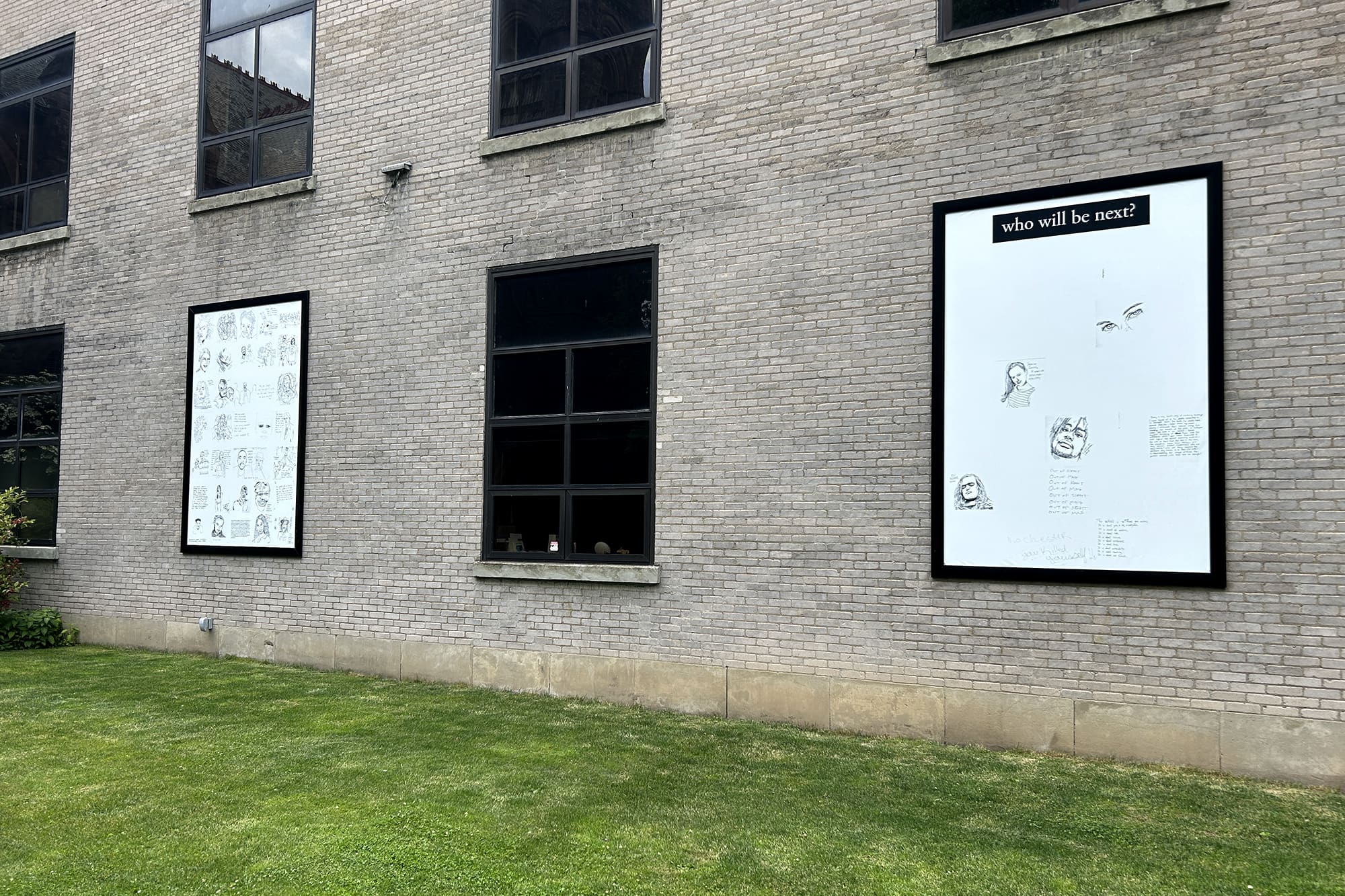 Public Art: Three large panels feature tracings from previous iterations of the memorial project, including both past and potential victims of gun violence, created during a 63-hour long community vigil. Sections of the panels are blank and will be filled with images created by the Rochester community.