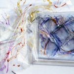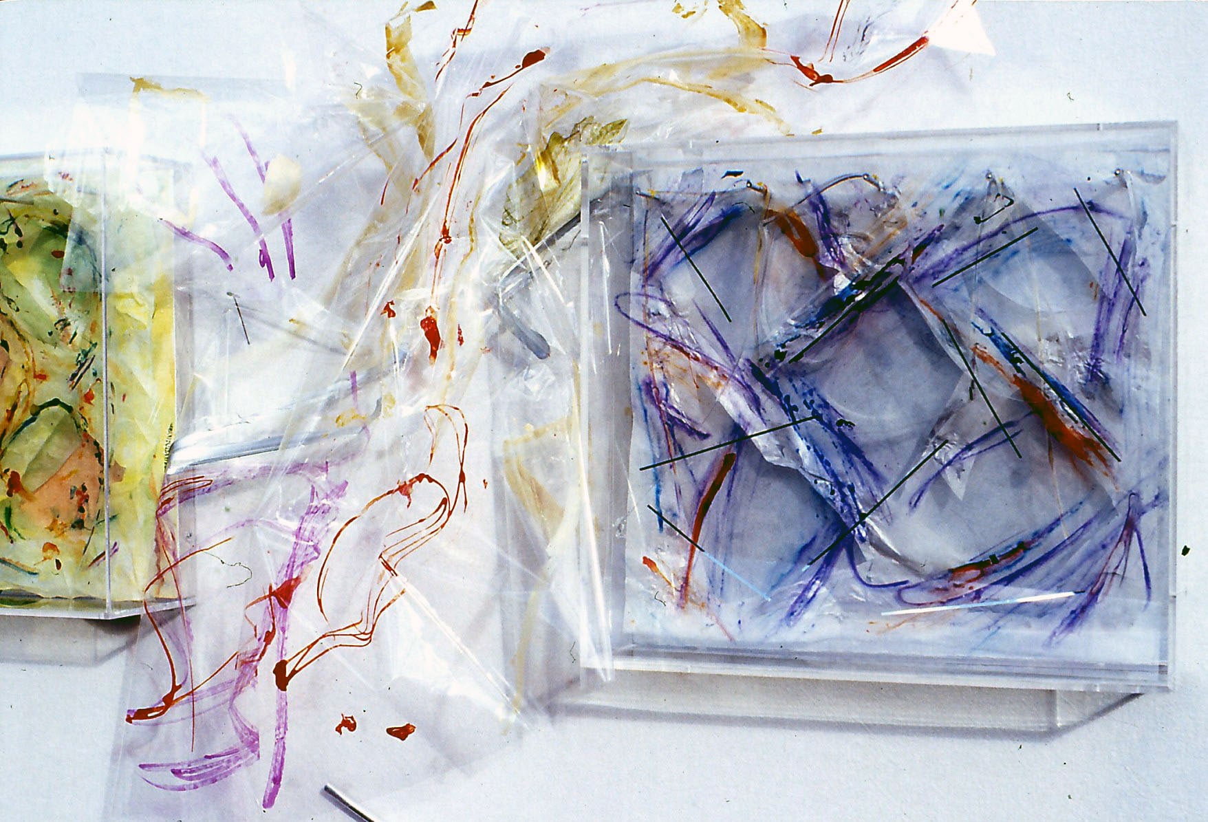 Within - Without is an installation by Jane Notides-Benzing that includes transparent cellophane, colorful shapes, and calligraphic lines suspended in air to create unbound abstractions.