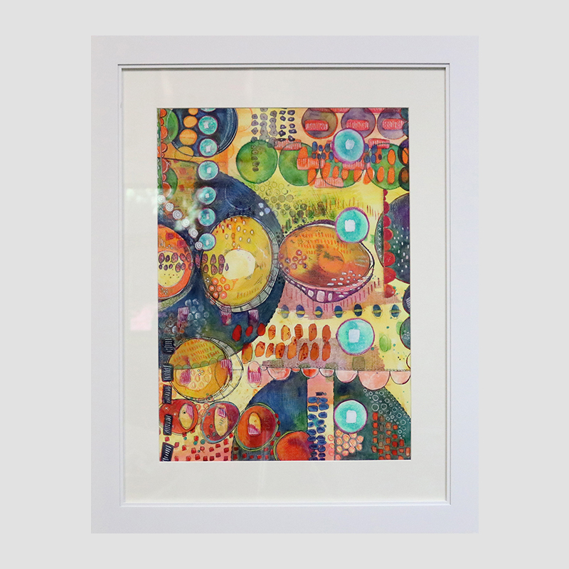 According to the artist, “Generally, I’m a non object, geometric, abstract painter and mark maker, however I do like to explore shapes from nature and abstract them in a way that I see them. I subscribe to modern color theory and use bright colors, bold shapes and meditative marks to explore design and composition … I use art as a way to process my emotions and deal with sensory overload.” Mertz sites Hilma af Klint and Wassily Kandinsk as artists that influence her work.